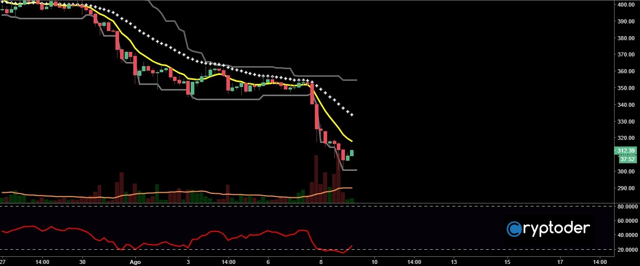 Observando el grafico de 4 horas vemos como el precio ha iniciado un rebote en los €300 euros, mostrando dos velas de recuperación en las últimas horas. El par aún está bajo la tendencia bajista por lo que debemos esperara el próximo movimiento para determinar si el precio decide iniciar un rally alcista o bien si vuelve a romper a la baja.