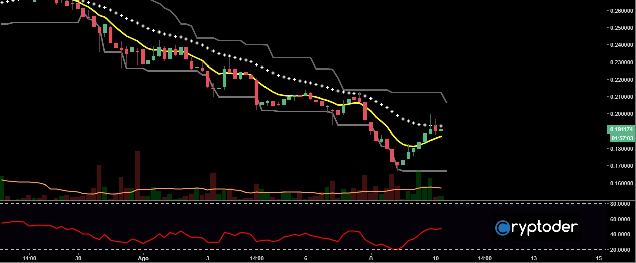 Dibujando un retroceso de Fibonacci vemos como el precio se mueve por encima del 23% de Fibonacci creando un soporte interesante en los €0.18 centavos. Por otra parte el XLM tiene una resistencia importante en los €0.22 centavos. Analizando el gráfico vemos como el volumen de compra fue elevado por algunos instantes para luego iniciar una caída, esto debe alarmarnos.