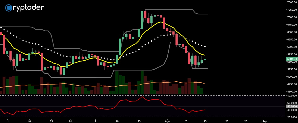 El par BTC/EUR encuentra como soporte principal los €5300 y como resistencia principal los €5750. El RSI se mueve al 40% incrementado de manera lenta pero constante.