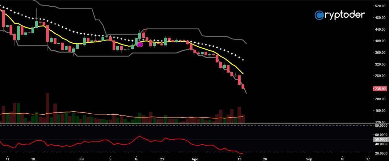 Abre la nueva sesión de trading bajo un mercado bajista, por otra parte. El precio de Ethereum está tocando nuevos mínimos en este 2018. El Ethereum reporta una pérdida de más del 15% lo cual envía el precio a una zona de negociación por debajo de los €250.