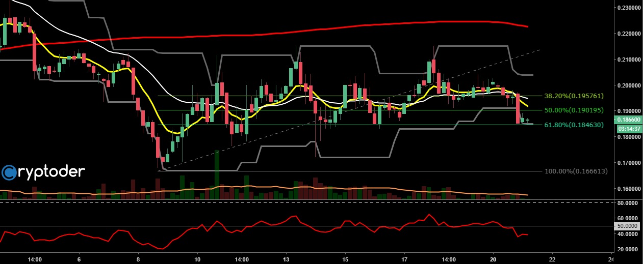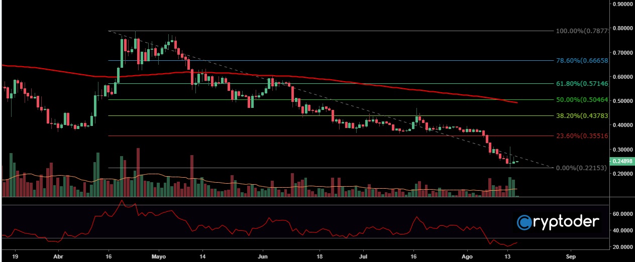 Por otra parte vemos como el precio rompe a la baja el Fibonacci del 38.20% moviéndose hacia el 61.80% el cual actúa como soporte en los €0.17, mientras el RSI se mueve por debajo del 44%.
