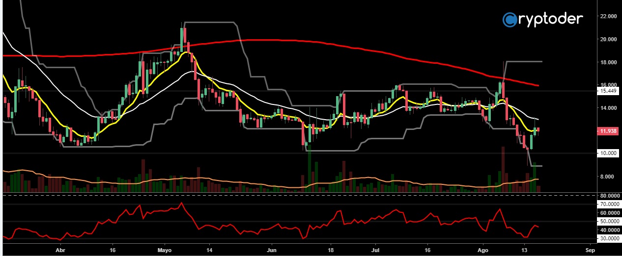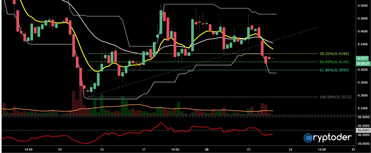 Analizando el gráfico de 4horas podemos ver como el precio ha roto la línea de soporte en los €0,50 llevando las inversiones a un punto delicado, esto debido a la gran cantidad de dinero en juego.
