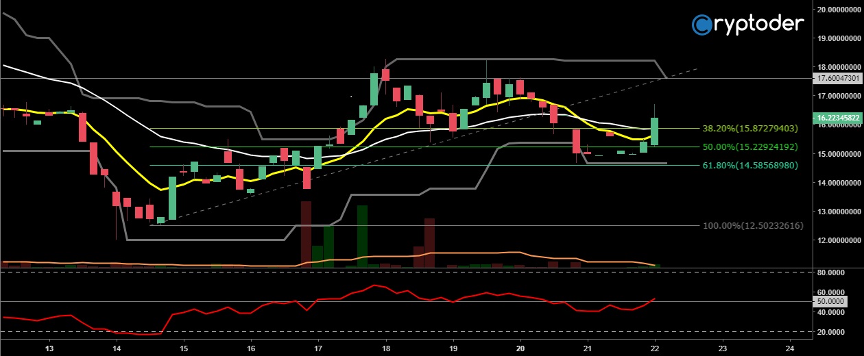 Analizando el gráfico de 4 horas podemos observar como el precio se movió similar al Bitcoin (en gráfico) permitiéndonos determinar que este movimiento se debe al incremento del Bitcoin en las últimas horas. Hay que tener en cuenta la decisión de la SEC el próximo jueves 23 y la creación de más de 451 millones de Tether ingresado en este mes.