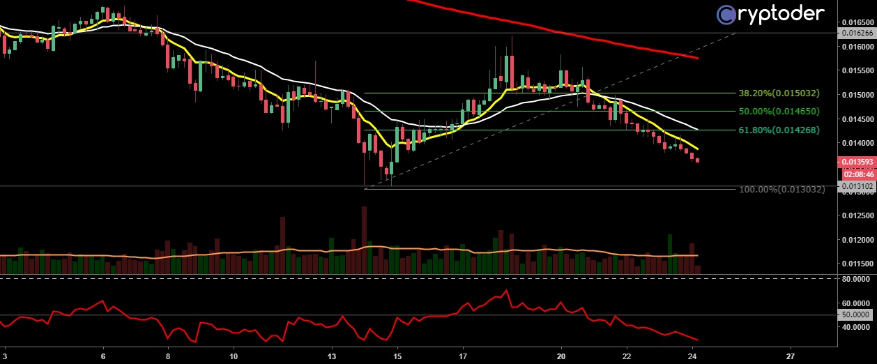 El precio se mueve por debajo del retroceso de Fibonacci del 61.80%, luego del cruce a la baja de las medias moviles (EMA) 6/26 el precio ha respetado la tendencia bajista y no volvió a tocas la media movil rápida por lo que el soporte en los 0.013102 BTC (€73.66) es un punto clave para el rebote.