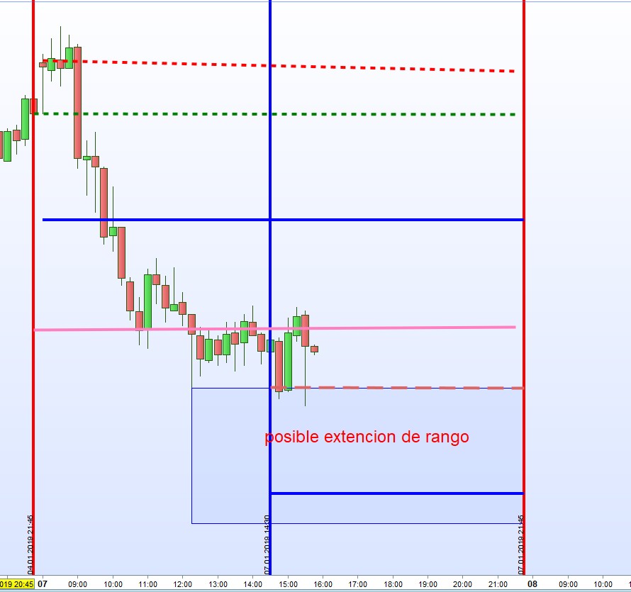 En cuando el grafico se presenta entre la primera y la segunda zona como hoy es decir sin ningun cambio de velas de 15M entretanto estoy muy alerto con entradas en la segunda zona. Tengo abierto graficos con 5M y 2M Heikin Ashi. No interesa de entrar con HA a la mitad de la zona y subir por consecuencia el Stopp Loss. Utilizo entonces el HA 2M y puede que el stopp loss se situa mas debajo. Pero aun asi hay dias sin remedio. Hay que aceptar perdidas y muchas veces puede de ser aliviada en la extension de rango.