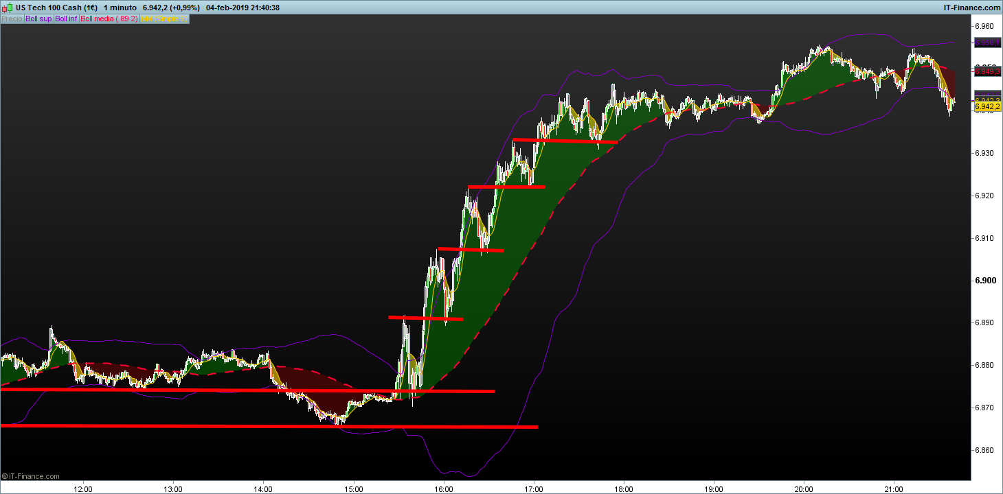 El DOW en intradia también lo dio muy cerca del máximo del viernes, no llego a tocarlo y por sistema se cierra en bollinger alta en 1m en esos escenarios tan cerca de esas zonas calientes
