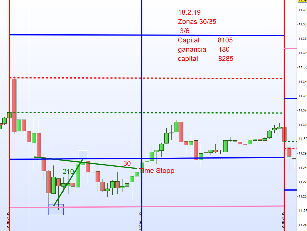 Resumen de la semana pasada. Con una ganancia de 1530€ ha sido la mejor semana de este ano. En los graficos aduntos observaran el dia 19.2.19 con una entrada por la tarde cruzando el precio el cierre del dia anterior. Este set up lo explicare manana.