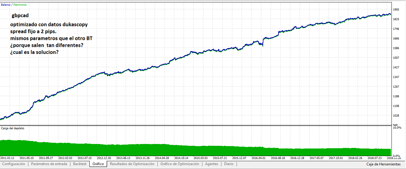 Por ejemplo, muestro 2 BTs, ambos mt5 uno con fuente dukascopy y otro con fuente proporcionada por metaquotes. Es valido preguntar cosas como ¿que fuente de datos usan? y es de reciente interes ya que hasta hace poco metaquotes mt5 no daba historicos (ni pares custom) sino que los descargaba directamente de cada broker. Asi con el resto de las cuestiones muy puntuales por cierto y que no ameritan grandes discusiones. Me sigo preguntando donde estan los quants.
