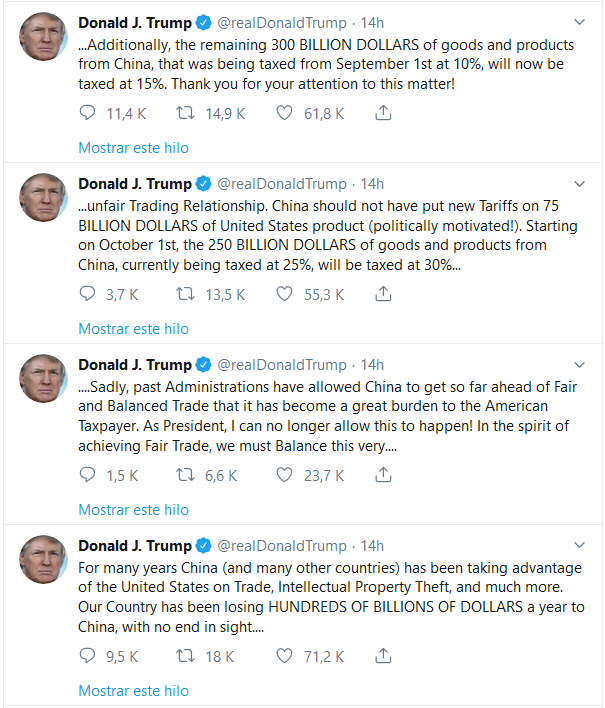 Además todo el mundo sabe que va de farol porque por muy presidente de EEUU sea no tiene poderes para hacer que las empresas salgan de China (y aún imponiendo ciertas medidas, eso no se puede hacer en un espacio corto de tiempo).