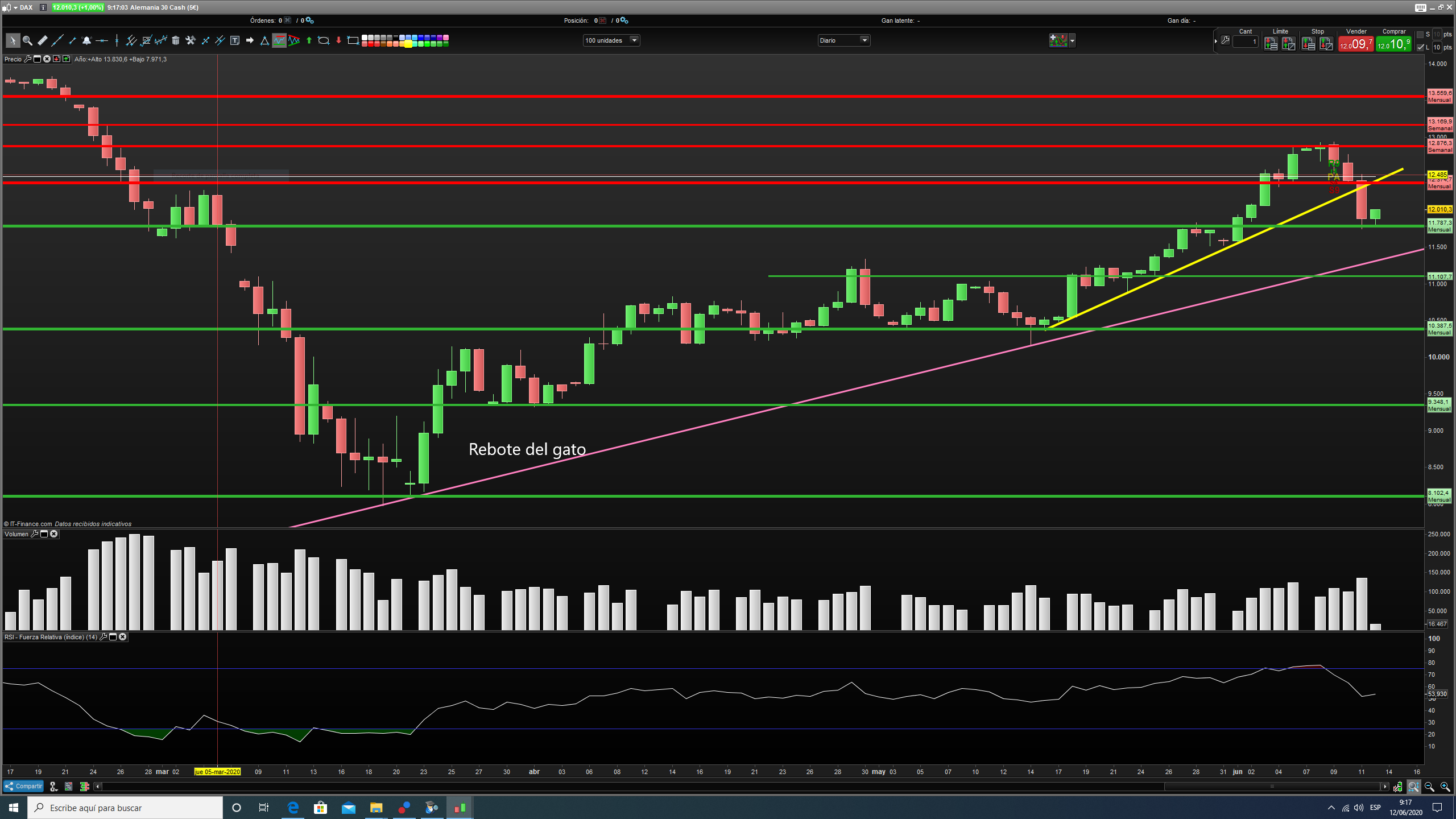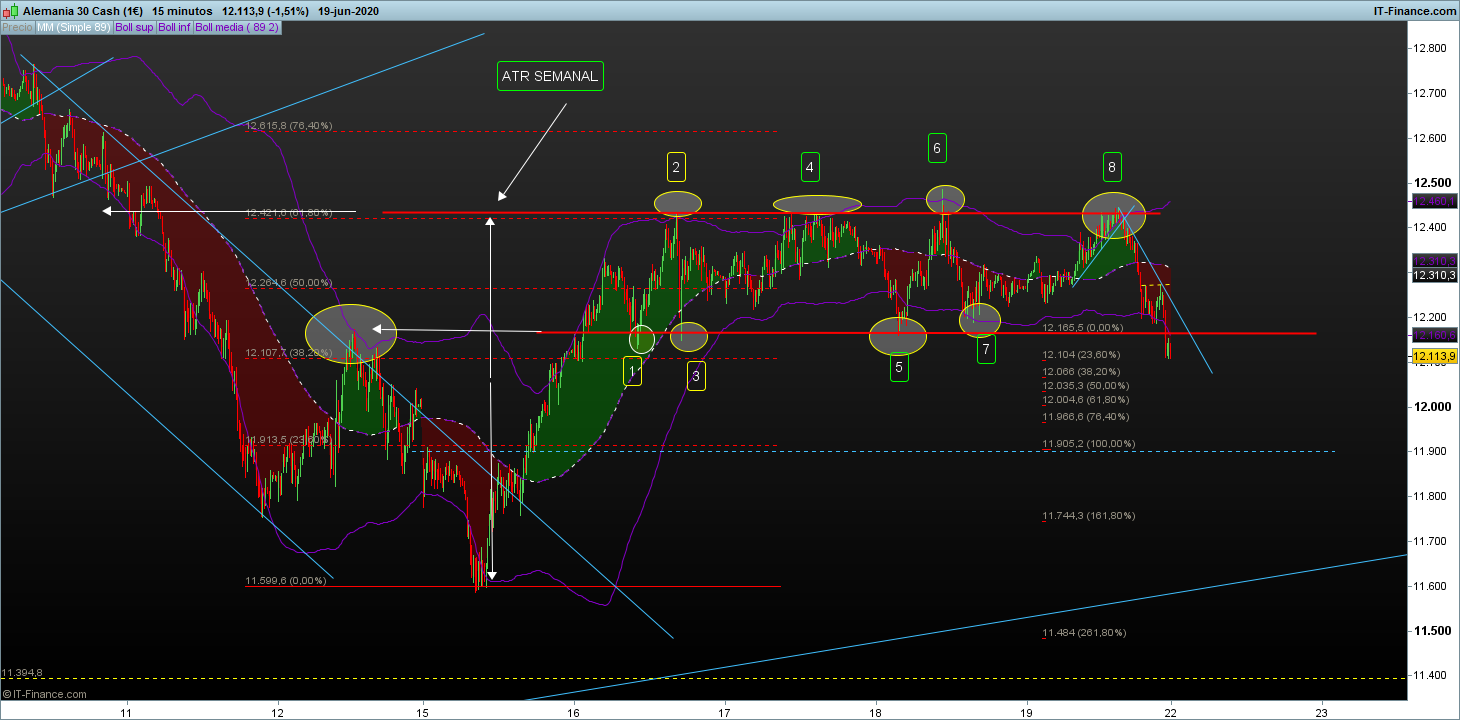 Si repasas las ultimas graficas que colgue en el hilo el dia 7 de junio, incluso con la volatilidad actual, el dax estuvo en rango desde primeros de abril hasta ultimos de mayo, practicamente dos meses en un rango acotado de poco mas de 1000 puntos y la mayoria de rebotes desde el soporte se quedaban practicamente a la mitad, pero es que pueden estar 6 meses o un año asi y no pasa nada porque es una pauta que se da y nadie sabe cuanto puede durar