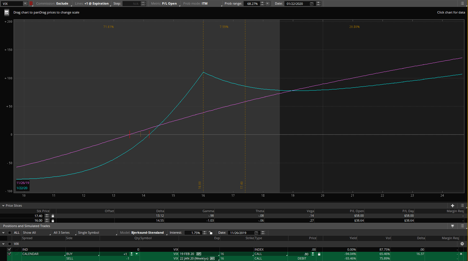 En mi poca experiencia operando opciones sobre el VIX y viendo sus gráficos en TOS, el gráfico es poco fiable, especialmente en la curva T+0. En IB la curva a vencimiento se parece algo a la de TOS, pero la T+0 es muy diferente (cuando la grafica). De todas formas, no suelo operar el VIX más que esporádicamente y con estrategias simples.OptionExpert escribió: 27 Nov 2019 12:13 cuando la cierre posteo El resultados y vemos si acierta. Para mi la operacion tiene mas vuelo por arriba que lo que da ese gráfico, por abajo si pierde