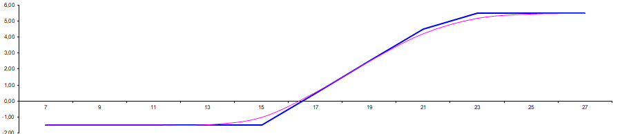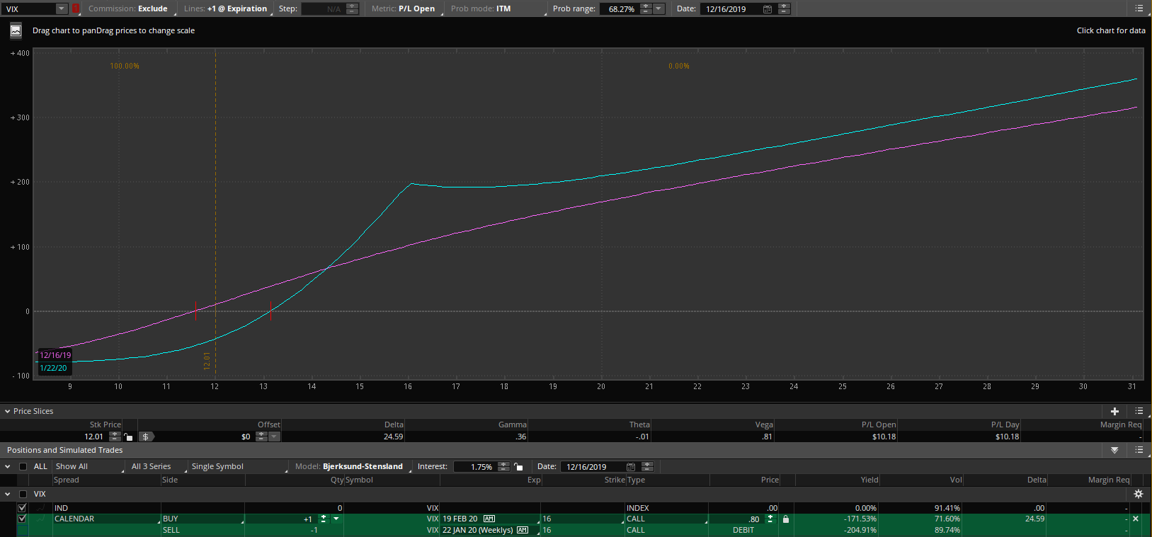 El gráfico de riesgo sería este, aunque por las características de las opciones del VIX, me lo tomaría con precaución. En azul, P/L a vencimiento; en morado, P/L actual. La dos líneas verticales son los valores de los futuros del VIX de enero y febrero hoy y el índice está por debajo de 12 (esa rayita marrón vertical entre las dos rojas).
