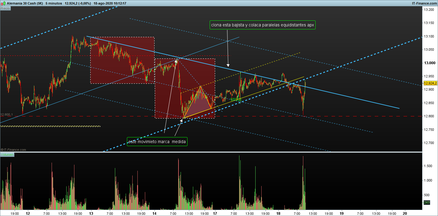 ayer el canal amarillo intradia la linea de techo es clonada de la linea base que arranca con dos pivotes en ese patron de arranque ( triangulo), se aprecia como cumple en volatilidad