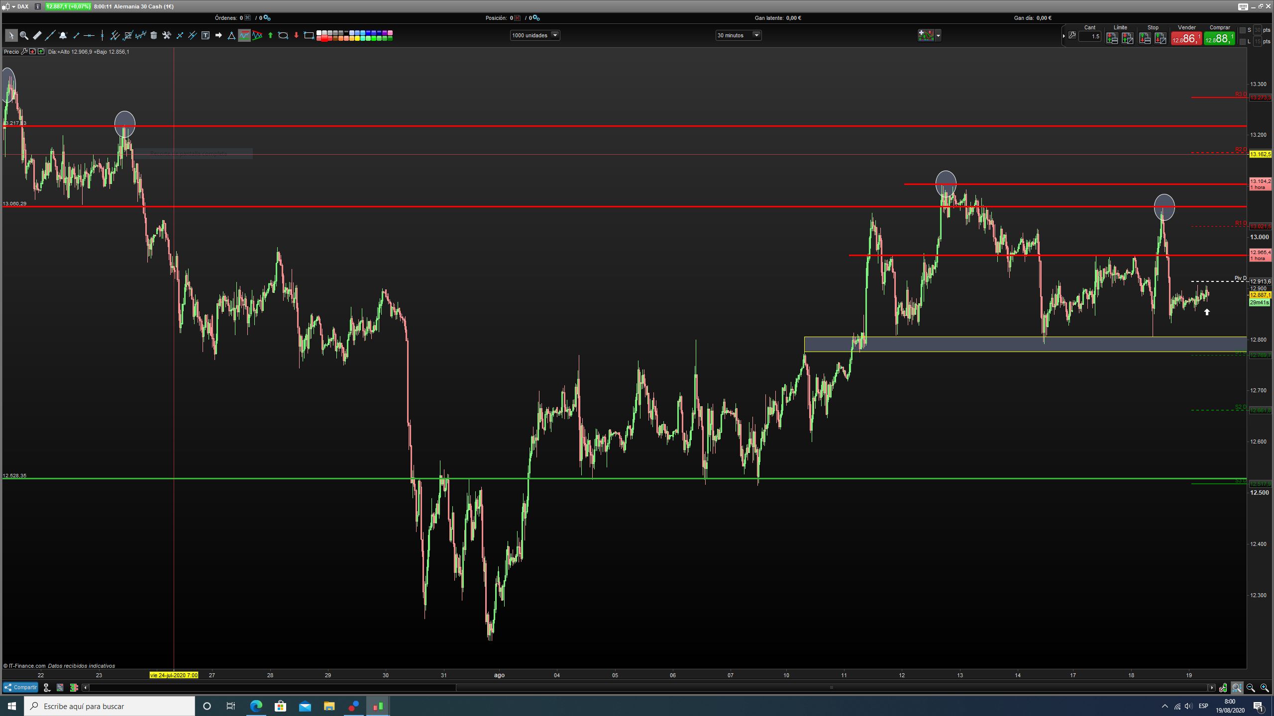 Marque la zona hacia abajo en lugar de hacia arriba, esperando fuese a testear los mínimos de ayer, así que hoy nada, pero me quedo con la idea