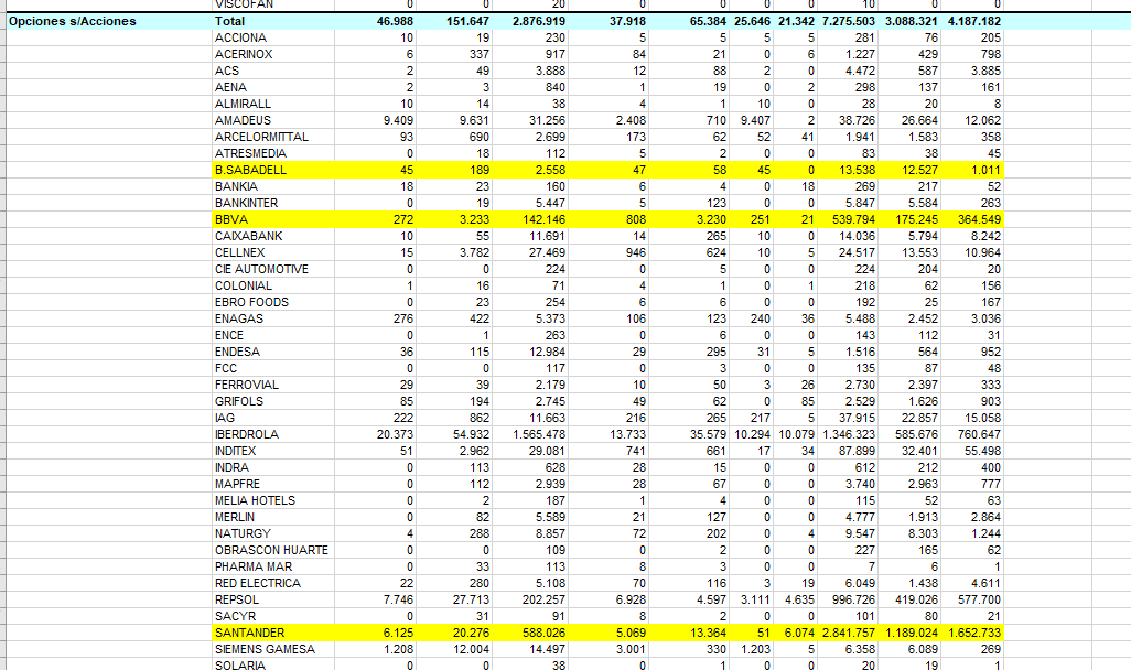 . En el acumulado mensual hay muchas más call que puts pero no lo veo suficiente volumen. BBVA si tiene mucho volumen. Aunque necesitaríamos poder ver el volumen promedio del último año.