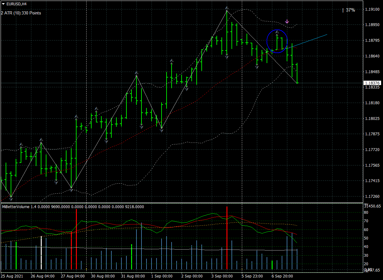 Nos econtramos en el final de una tendencia en H4. La vela actual es la vela 0, la anterior la vela 1, y después viene la vela 2 etc. Bueno, pues en la vela 12 tenemos un volumen climático en una vela con una gran mecha superior lo que nos dice que ahí han vendido fuertemente los insiders o profesionales. Las velas 3 y 4 son de rango muy estrecho pero con alto volumen después de un reversal de las velas 6 y 7 lo que nos dice que esas vela de bajo rango y alto volumen ha habido fuertes ventas. El panorama es de debilidad. El maximo de la vela 1 forma practicamente un doble techo y junto con la vela dos un potente reversal. No han necesitado un gran volumen ya que las ventas se hicieron anteriormente. El primer techo esta bastante sobrecomprado según nos dice la banda superior de Bollinguer (a partir de a ahora BB).