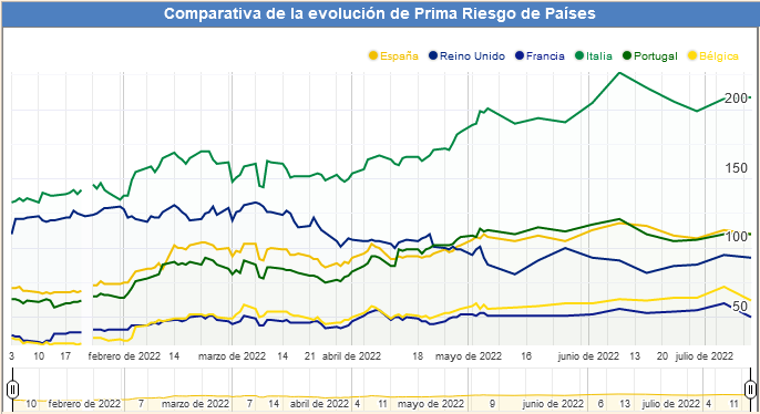 Algunos gráficos para reforzar la idea anterior (aparte del más que evidente gráfico del EURUSD rompiendo la paridad). Por un lado, las primas de riesgo de varios países frente a Alemania (todas disparadas, hasta aquí nada nuevo):