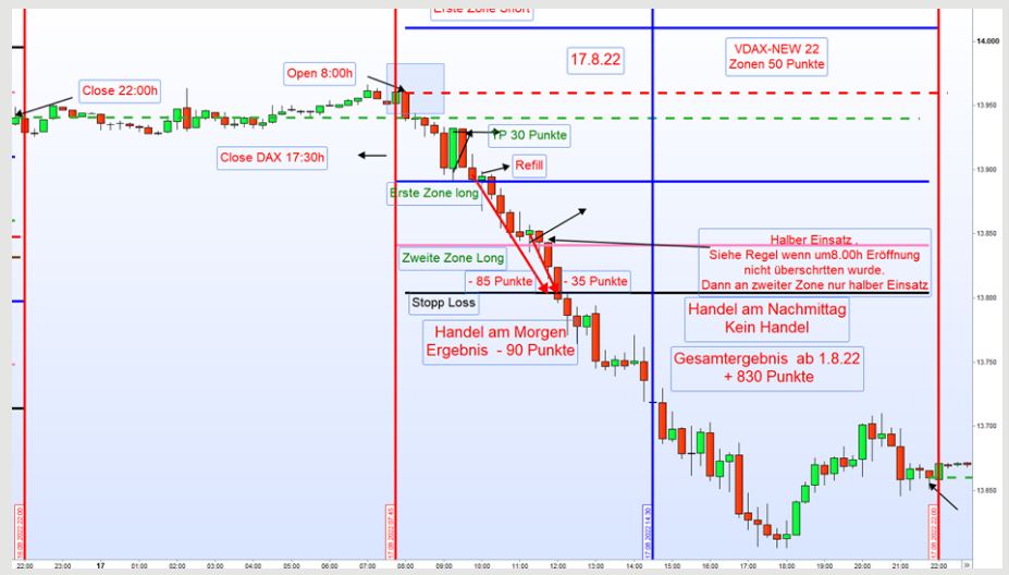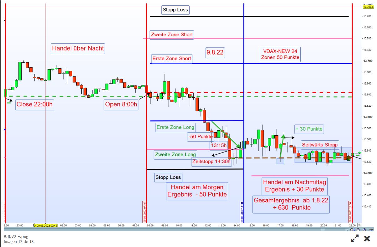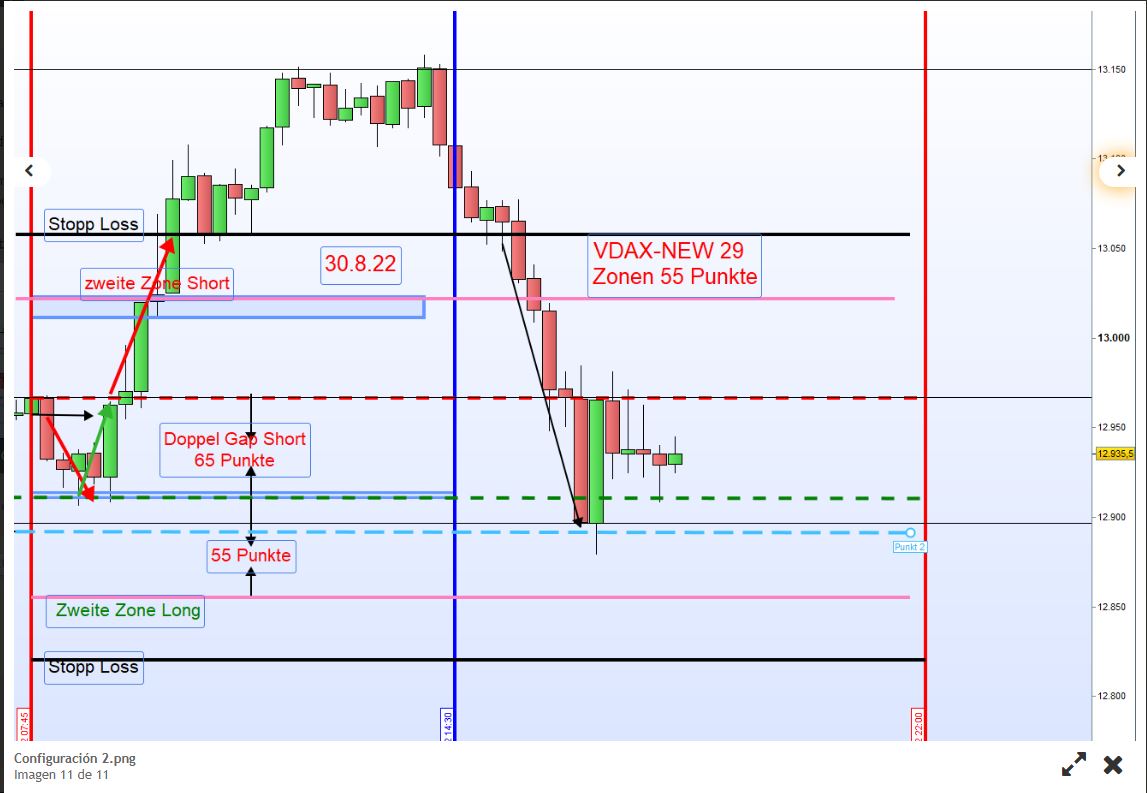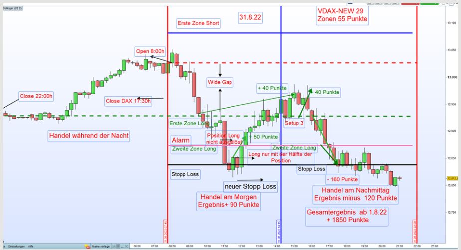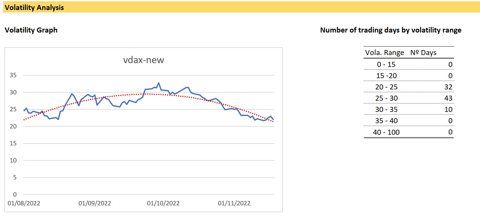 Pasemos ahora a la rutina, en primer lugar seguimos viendo la volatilidad: Cómo implica la volatilidad en la estrategia, a medida que disminuye, los movimientos del FDAX son más estrechos y el precio se mueve más lento, por eso ajustamos las zonas conforme indica Georg.