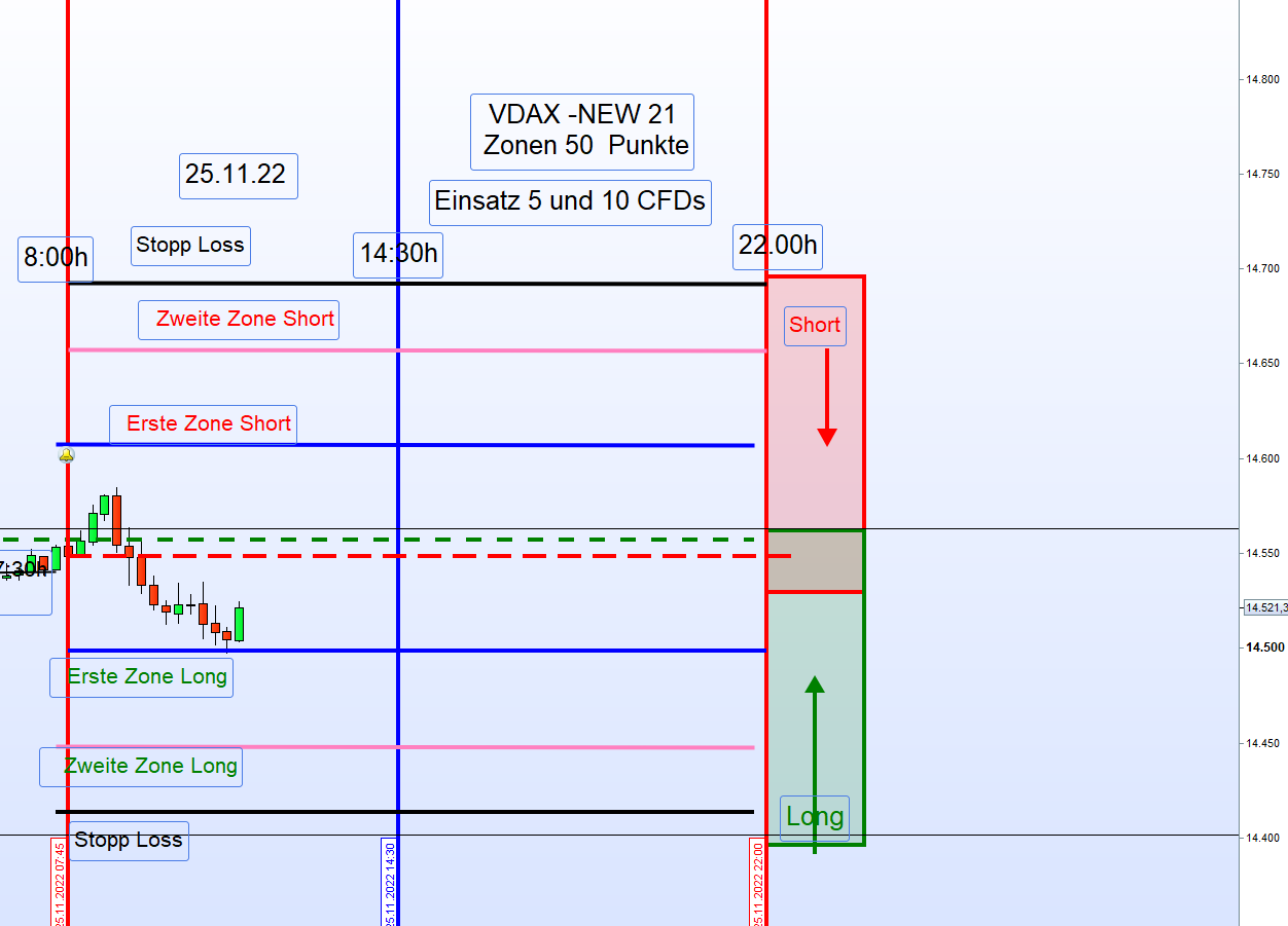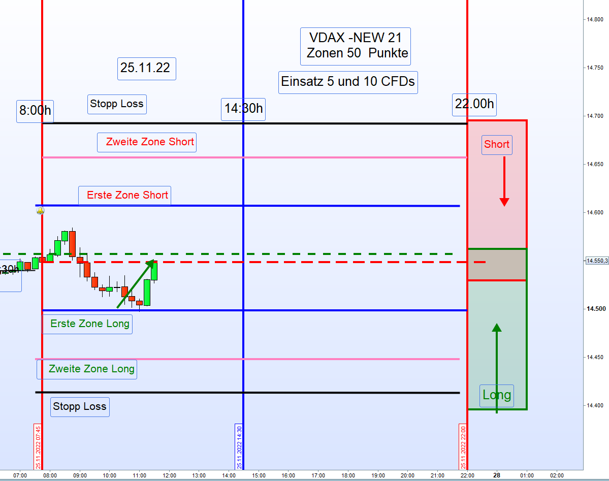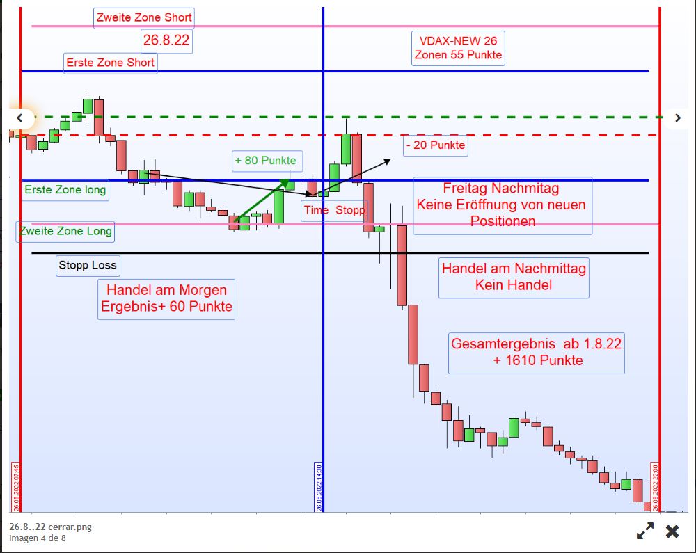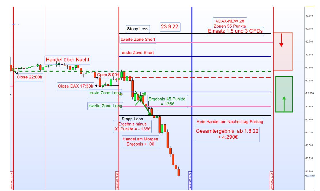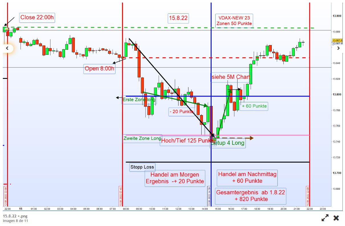 Pasemos ahora a la rutina, en primer lugar seguimos viendo la volatilidad: Cómo implica la volatilidad en la estrategia, a medida que disminuye, los movimientos del FDAX son más estrechos y el precio se mueve más lento, por eso ajustamos las zonas conforme indica Georg.