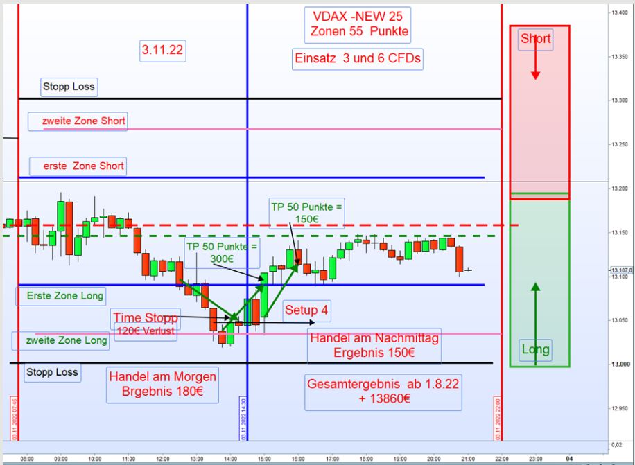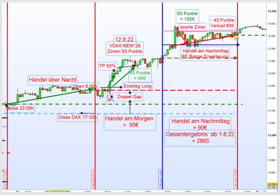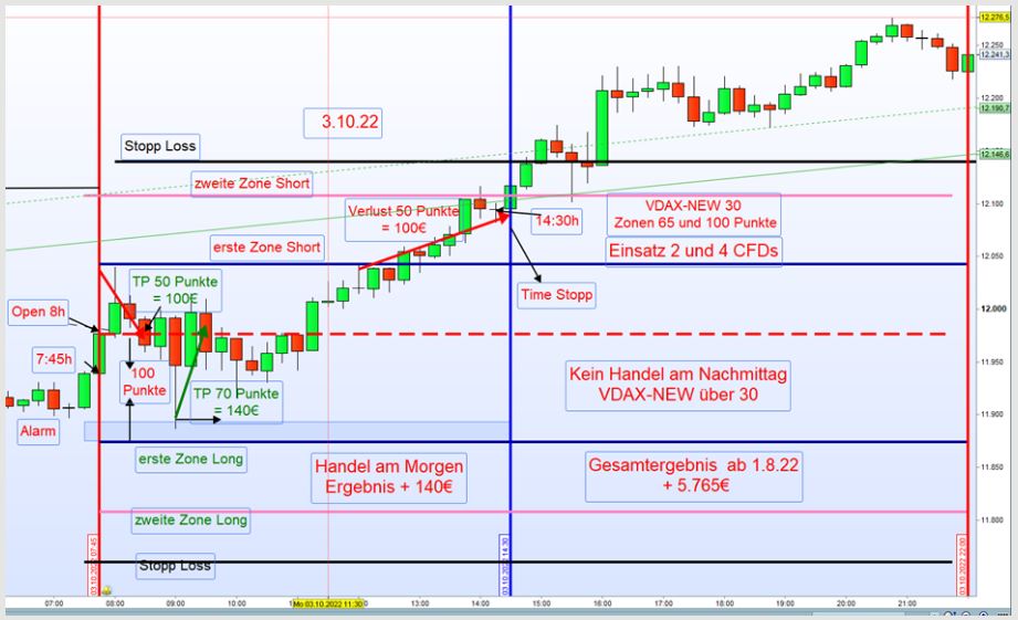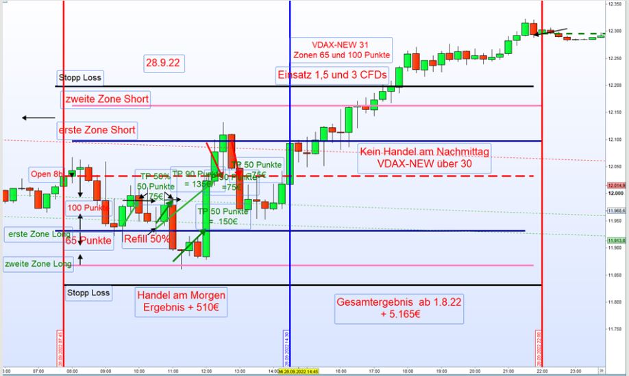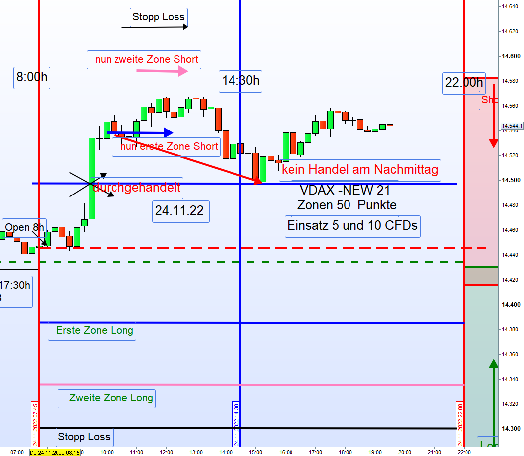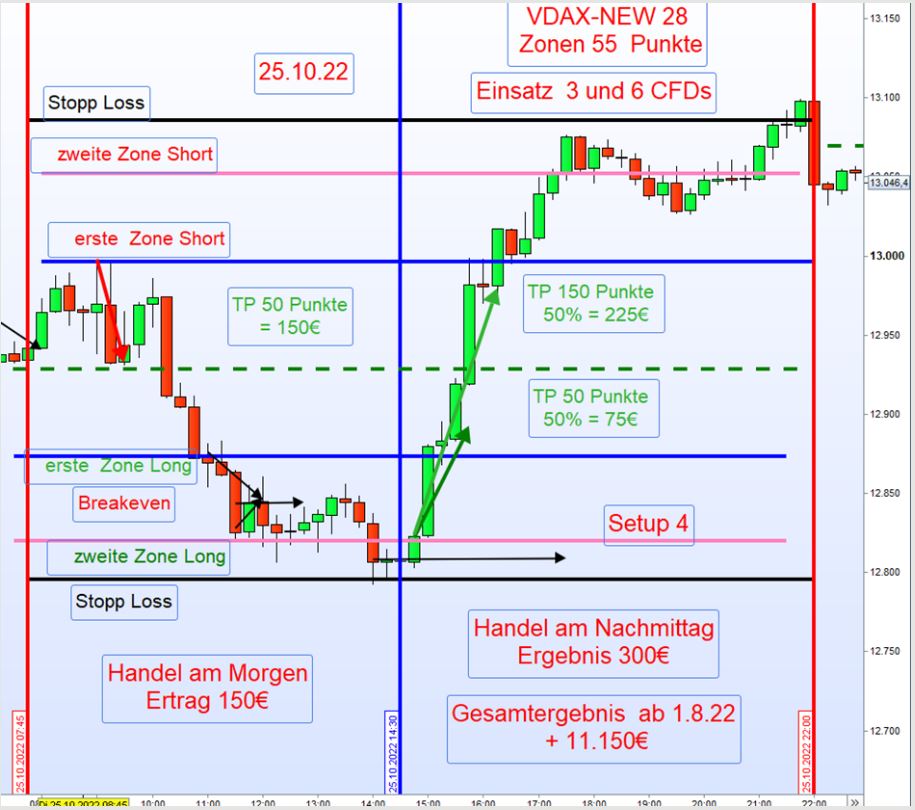Pasemos ahora a la rutina, en primer lugar seguimos viendo la volatilidad: Cómo implica la volatilidad en la estrategia, a medida que disminuye, los movimientos del FDAX son más estrechos y el precio se mueve más lento, por eso ajustamos las zonas conforme indica Georg.