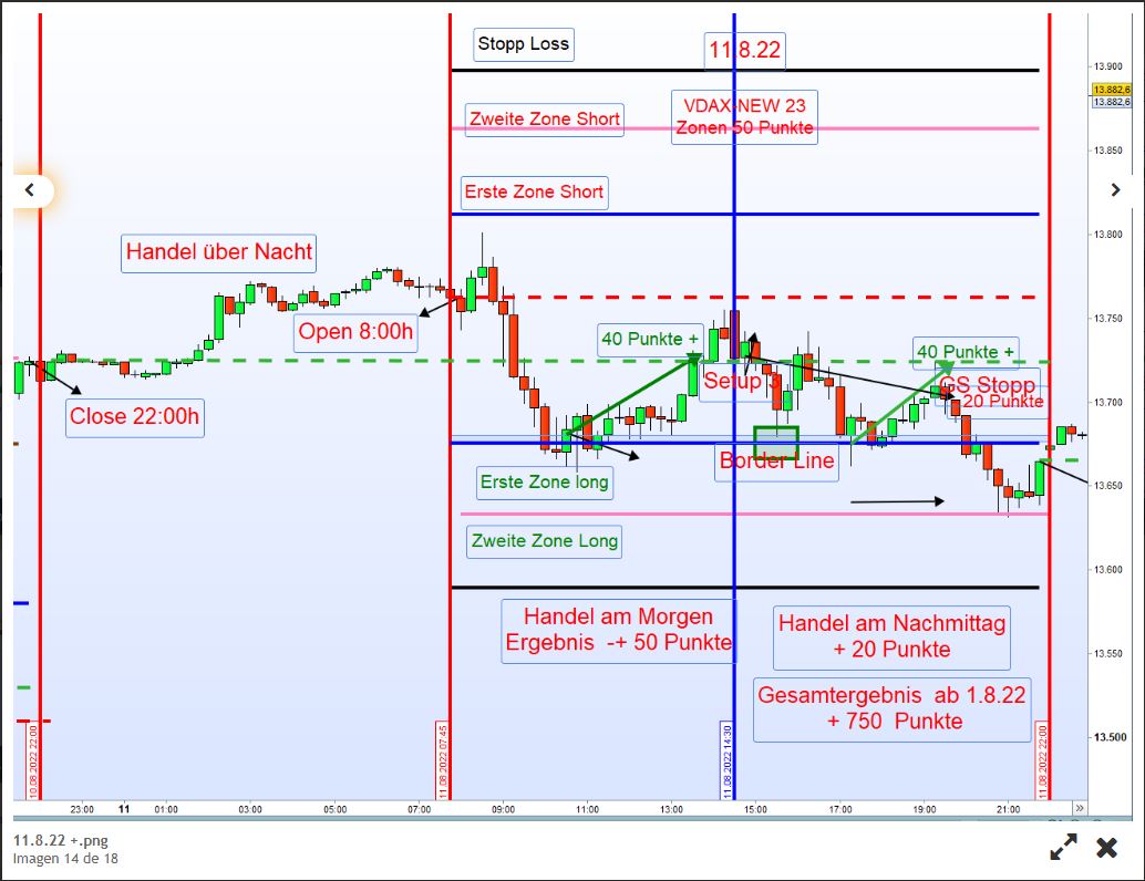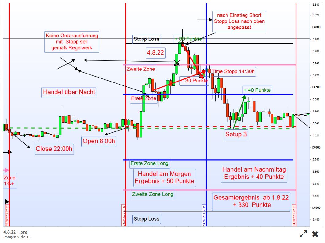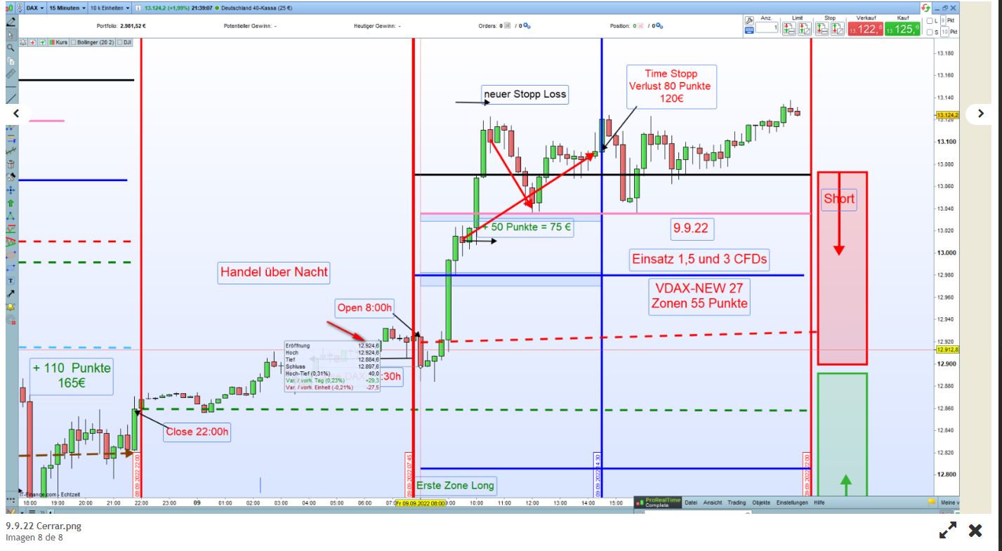 La primera zona de cortos, línea azul superior (en adelante S1) se alcanzó en la vela de 15m a las 9:30, pero tal y como se observó, no hubo reversión y por tanto esperamos y no entramos, fue en la vela de las 10:15 donde se produjo la reversión y por tanto ese punto se convierte en la primera zona, a partir de esta entrada se modifica el marco operacional situando la segunda zona de cortos (S2) 50 puntos por encima de la entrada y el STOP de pérdidas a 85 puntos de la entrada. La experiencia y audacia de cada uno entra en juego, en mi caso salí con breakeven, pero los más expertos hubieran obtenido el 100% del trade tal y como refleja Georg en su gráfica.