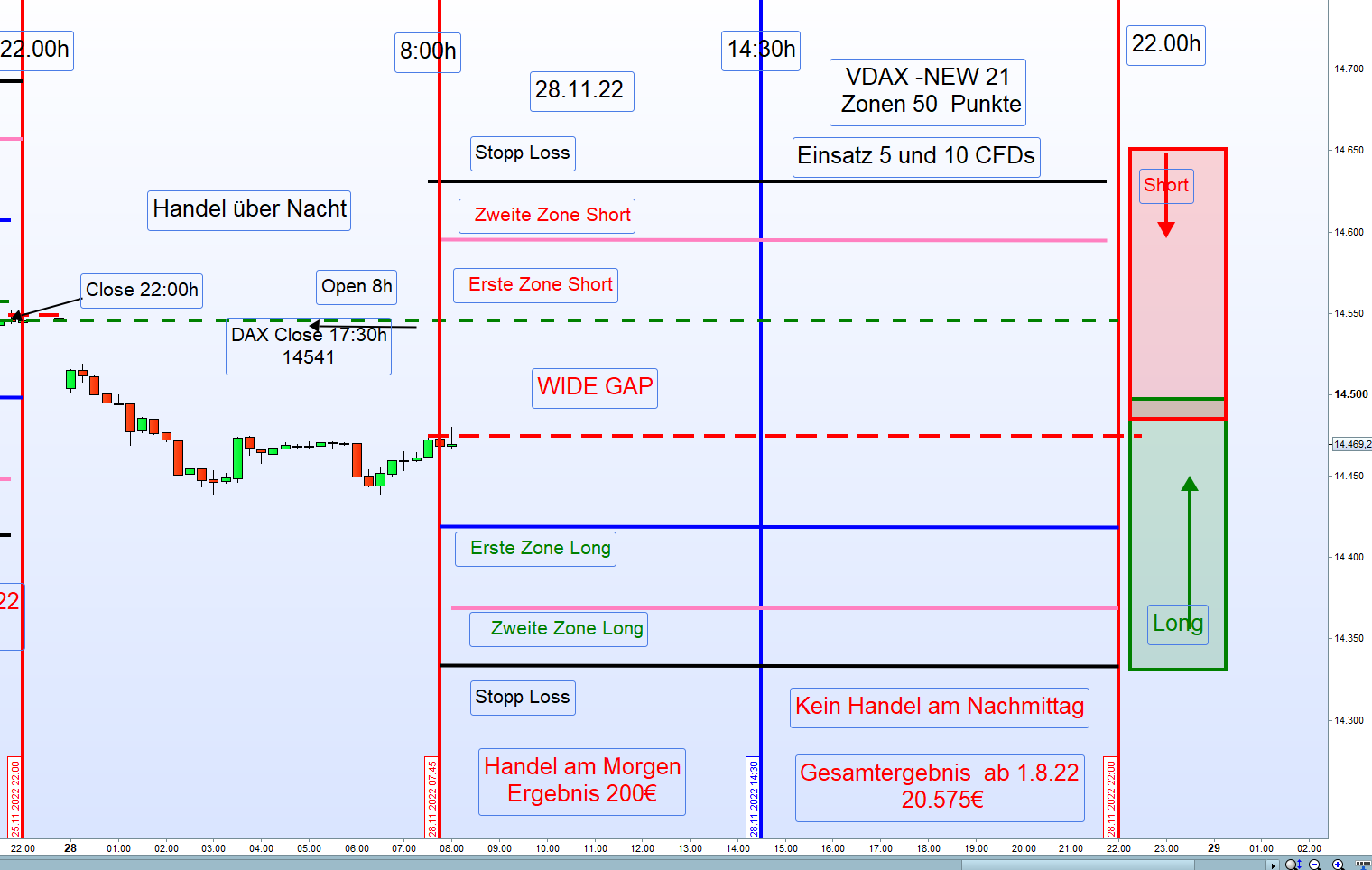 Por otro lado, también se observa que los días de baja volatilidad del VDAX-new (por debajo de 25) suele haber menos días de GAPs, por lo que tenemos el cierre del miércoles y la apertura del jueves a poca distancia y los niveles de entrada, según la estrategia se sitúan a 50 puntos.