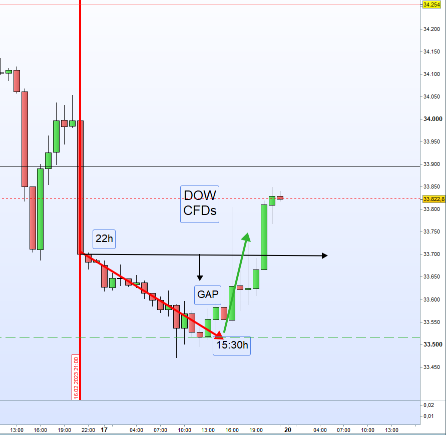 El DAX ya se había recuperado del mínimo del día a las 15:30, hora de apertura de la bolsa estadounidense, mientras que el DOW FUTURES (DJIA FUT) seguía en mínimos. Si el DOW repunta como consecuencia de ello, no hay ninguna posibilidad de que el DAX retroceda, especialmente el viernes por la tarde.