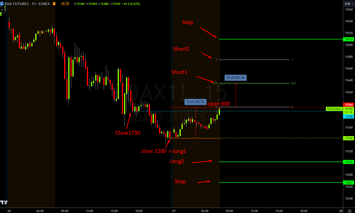 Si mal no lo he entendido, el rango de la mañana ha sido menor a 100 puntos, por lo que restamos 100 puntos al máximo cuerpo de vela de m15 para determinar los niveles de posible largo. Teniendo eso en cuenta calculamos los niveles de largo 1, 2 y stop restando 40, 80 y 115 a ese nivel de [máximo nivel cuerpo vela menos 100].