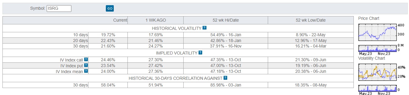 La volatilidad en las acciones tiene un patrón diferente a los índices o ETF debido a los earnings trimestrales. En la mayoría se produce un incremento en la IV algunas semanas antes del evento para caer en picado tras la publicación. Una imagen de acción ISRG (Intuitive Surgical) por poner una que sigo, pero es un patrón muy común. Se puede apreciar los incrementos de IV previos a earnings