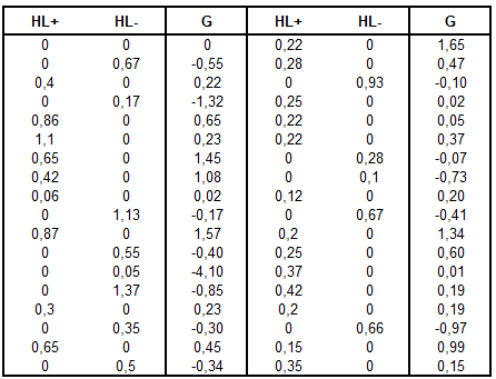 Si analizamos esta pequeña muestra, comprobamos como cuando el gap es negativo, en indicador HL-, toma un positivo (no cero), y cuando el gap es positivo, el indicador HL+, toma un valor positivo (no cero).