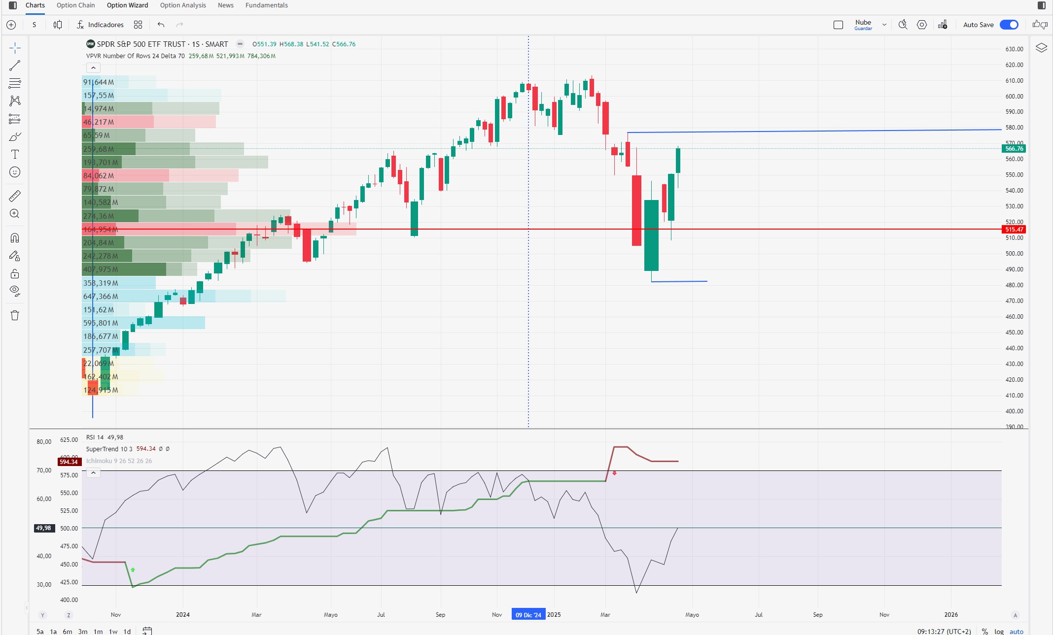 El problema viene ahora con el SPY. Tiene que perforar el 576 con contundencia para hablar del fin de la corrección. Y parece que tiene una divergencia oculta en el RSI.