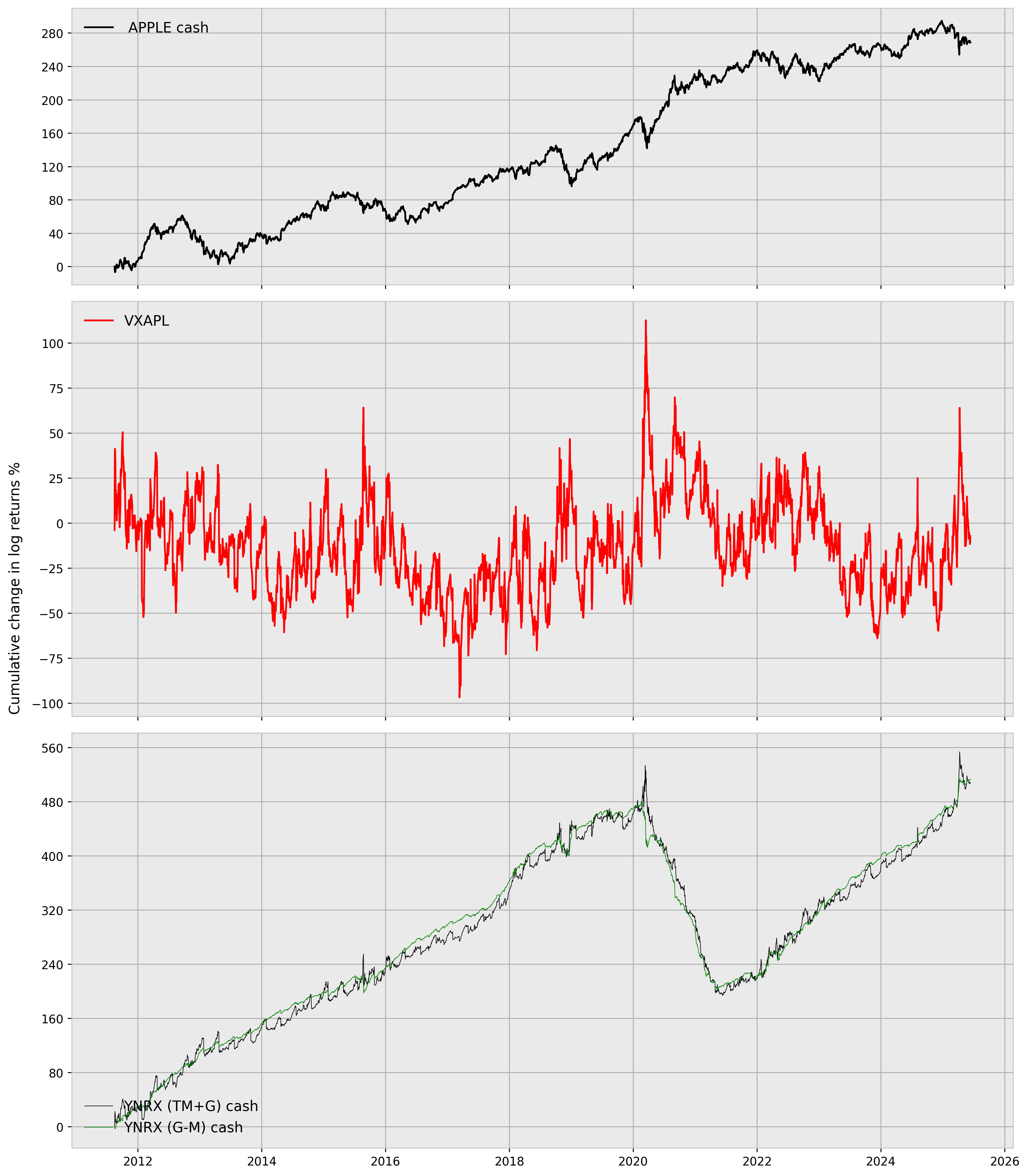 Si, ya es una realidad las Bandas GSR mini, una variable tiene dientes de sierra, y otra es una línea más estable, más lineal, y cuando las dos se tocan, boom, mínimo del apple a través de su índice de volatilidad implícita VXAPL.