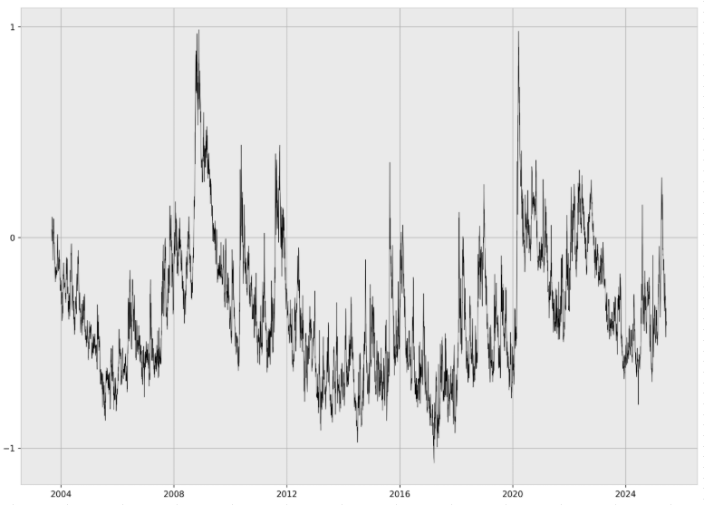 Y ya la risa padre, por que ostias al restar las variables que generan el mínimo de mercado, sale de forma natural un gráfico que oscila entre 1 y -1, y los dos picos donde tocó el 1, son los mínimos del nasdaq 100 del 2008 y del 2020. Es demasiado curioso, me recuerda al RSI pero esto oscila entre 1 y -1