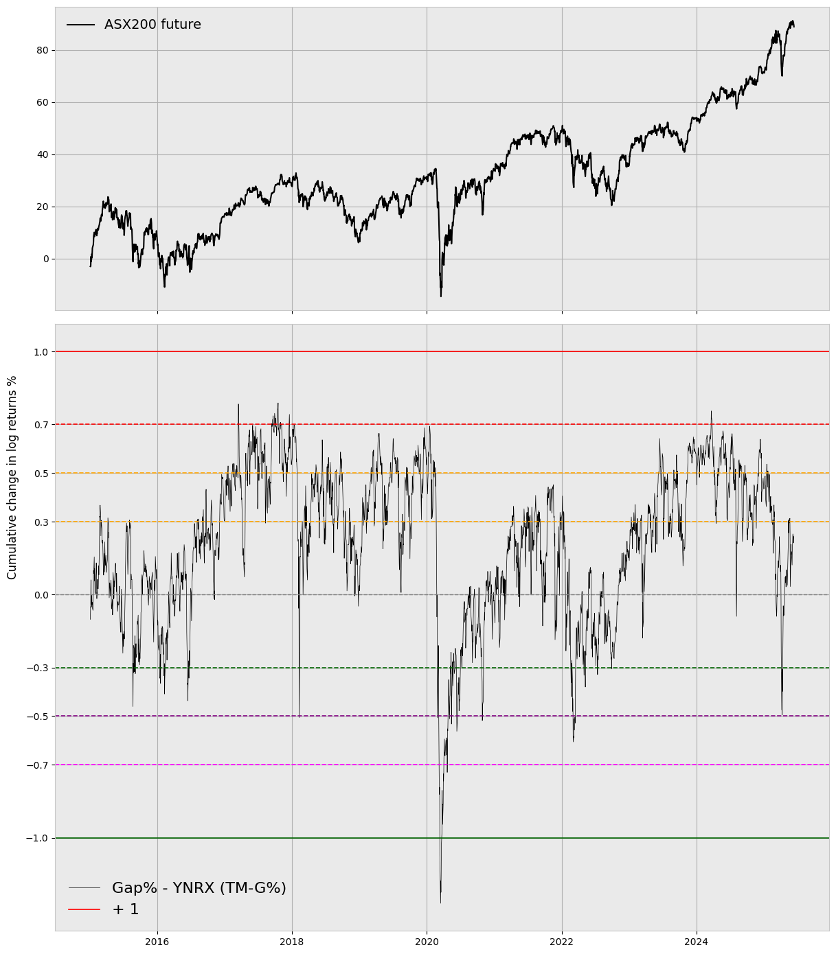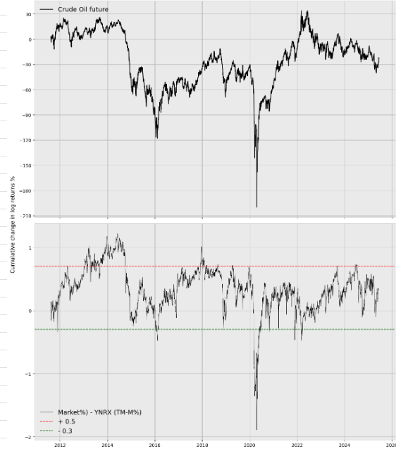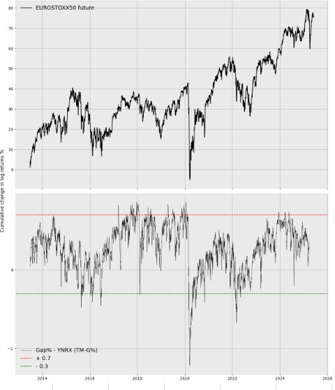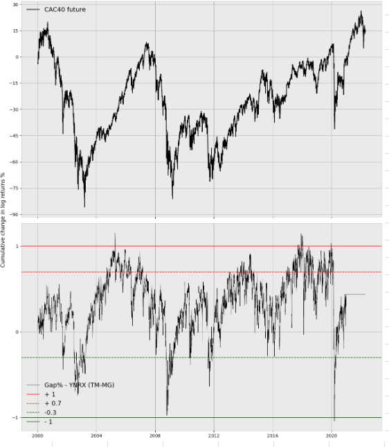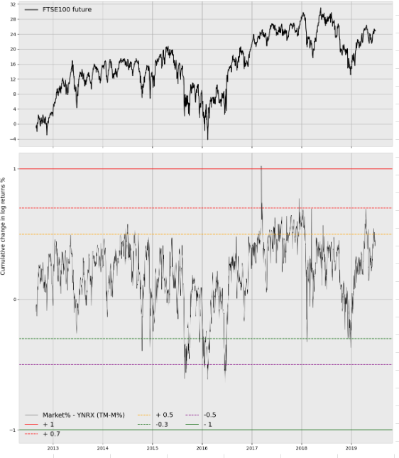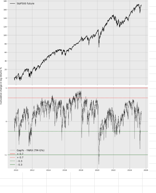 Las líneas que veíamos al principio (modelo Yanirax (YNRX), Minijefa (MBI) y RSG, aplicados sobre un índice de volatilidad implícita), y que marcaban los mínimos de mercado de los activos analizados, parecen siempre oscilar entre un rango de 1 y -1, y muy especialmente entre 0,7 y -0,3.
