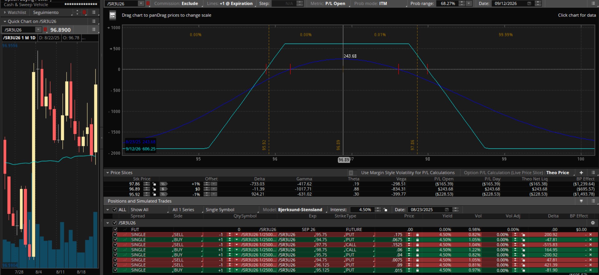 Con el ajuste ingreso $106.25 más de prima, aunque asumo más riesgo por abajo. También cambio el signo y magnitud de delta, así como el valor de las otras griegas.