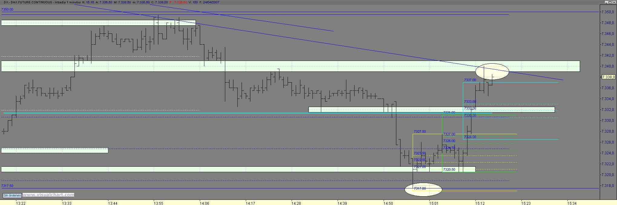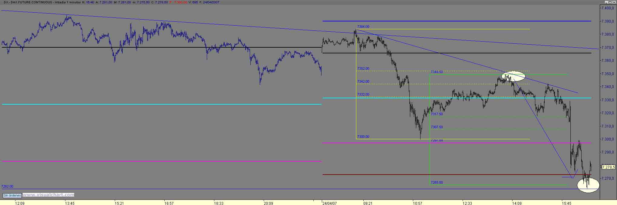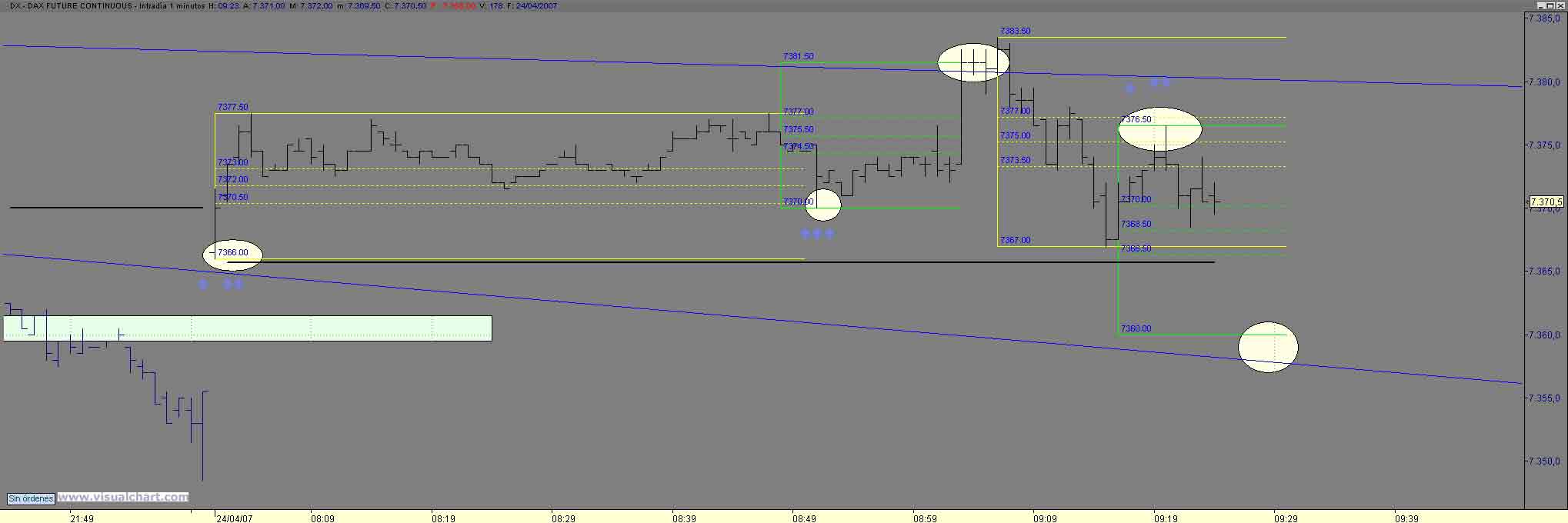 B dias y primaverales dias ya estamos en la batalla y hemos tenido las primera escaramuzas pequeñas pero ahi estan esa apertura en 66 nivel de pivot justo encima de la direztriz bajista  secundaria era toda una invitacion a tomar largos  con obj en ese prim,er impulso la direztriz principal y proyeccion del impulso  7381.50 no puede con ese nivel  retrocede a la apertura y hace retro de Fibo al 61% donde intetamos ahora cortos con un primer obj 60 que coincide con la direztriz secundaria bajista el sto al 79.50 Un Saludo