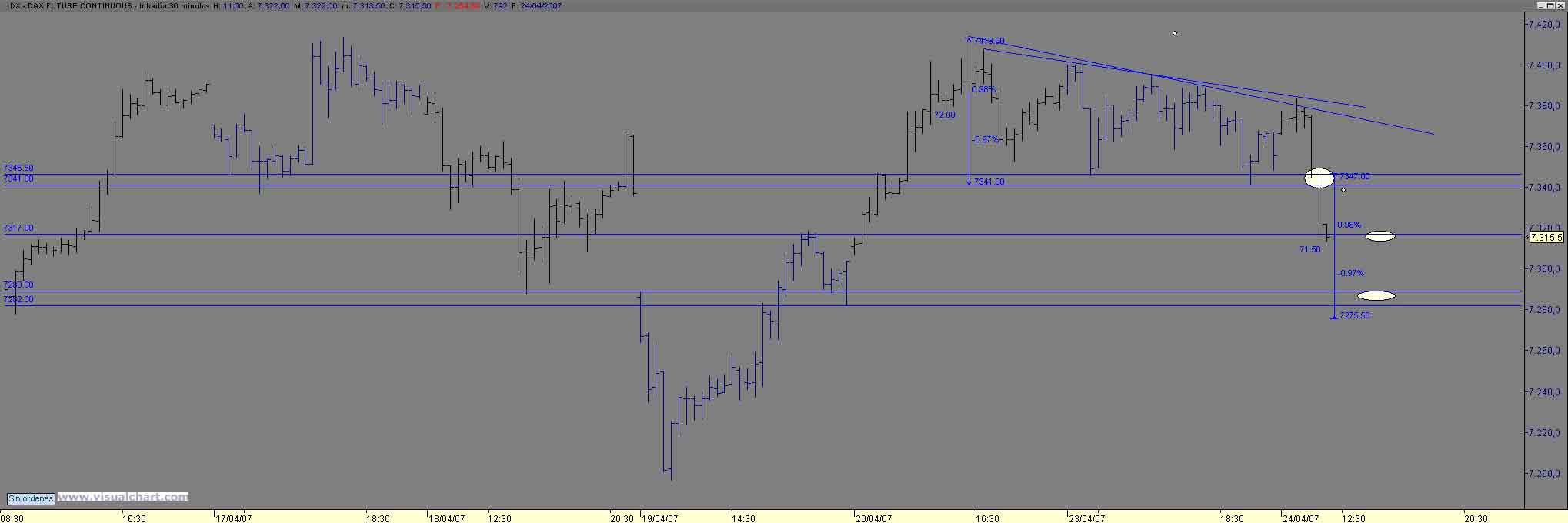 Pues casi sin querer nuestro amigo llego se paro penso en 7351 (que casulamente es el 61% de Fibo del mov intradiario 751.50)  y en eso estamos no vamos a valorar un impilso mas gordo hacia abajo por  logica pero si a tener en cuenta que no me gustaria que el 29 lo perdamos y menos el 21  todo preparado para los Usa Un saludo