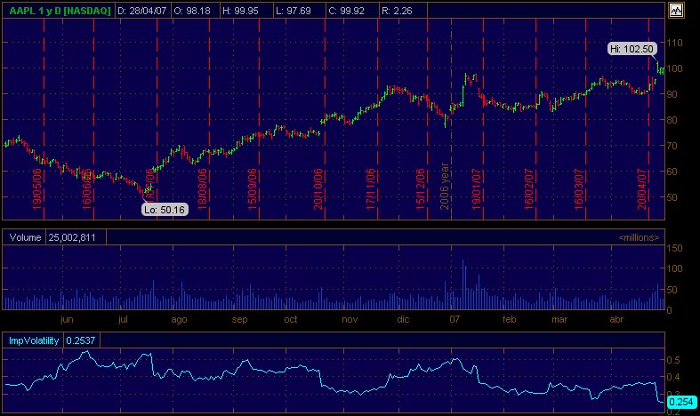 Los últimos días las acciones de APPLE han realizado un rally hasta las inmediaciones de los 100$ que ha llevado a sus opciones a cotizar unas volatilidades implicitas anormalmente bajas.