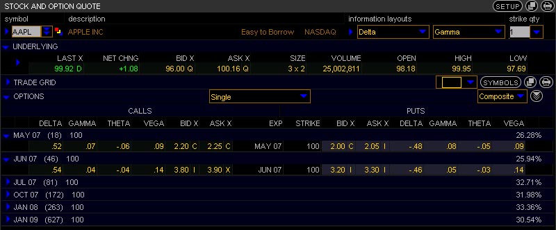 que quiere decir que abro 6 posiciones cortas de Calls sobre AAPL (Apple Inc) con un precio de ejercicio de 100, vencimiento de Mayo de 2007 a un precio de 2.20 $.