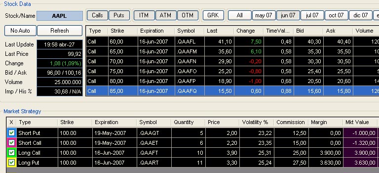 Cuando propongo "la compra de un straddle 100 vencimiento Junio de 2007" estoy proponiendo la compra simultanea de una serie de puts y de calls de precio de ejercicio 100 y vencimiento Junio de 2007.