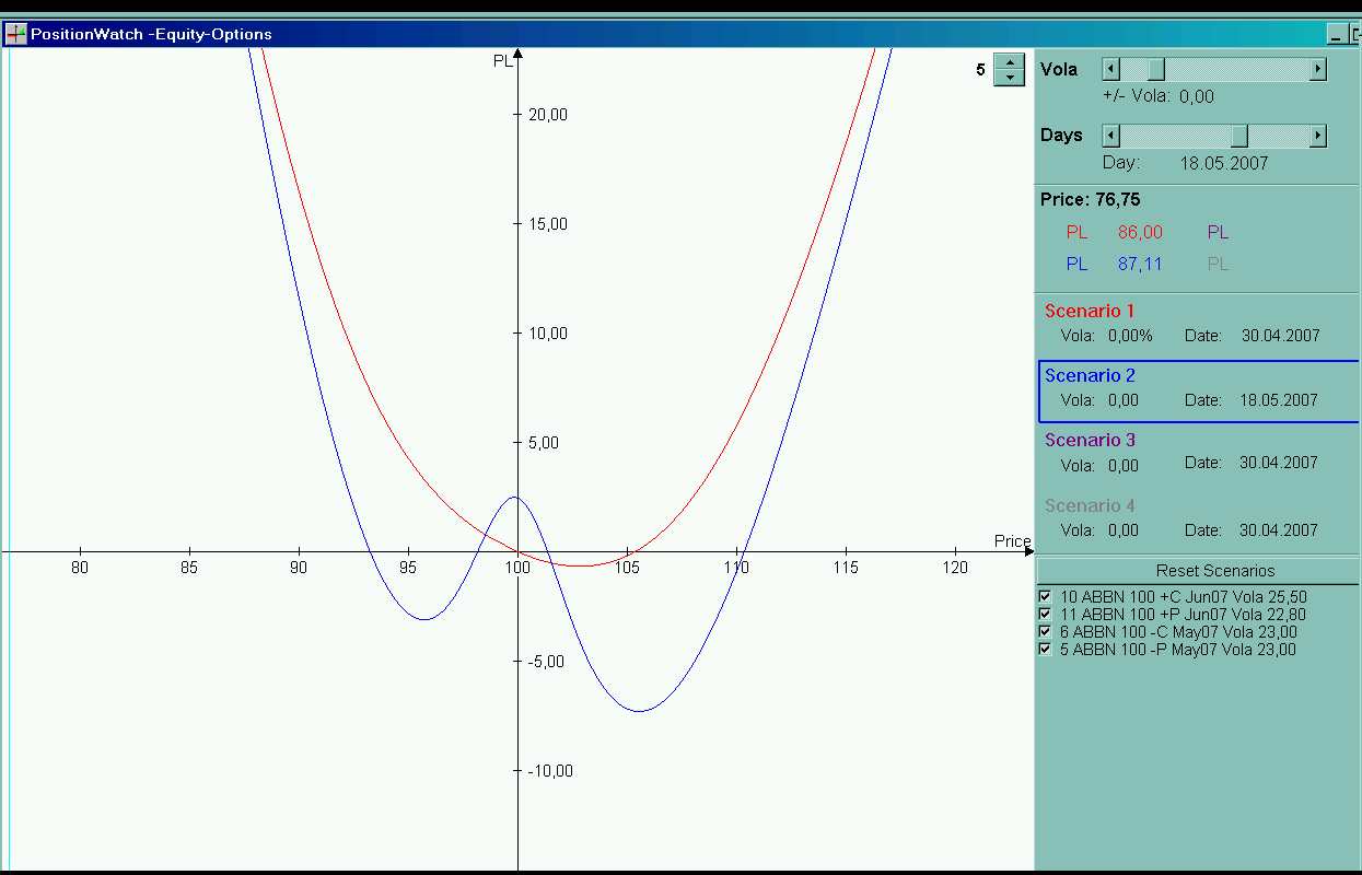 no entiendo bien que quieres conseguir con esa estrategia. Desde mi punto de vista, al tener distinto vencimiento no deben mezclarse. ¿Que situación tendremos al dia siguiente del vencimiento de mayo? Las opciones compradas tendrán su valor independientemente de lo que haya pasado con las opciones vendidas. En el mejor de los casos, estas últimas nos habrán servido para financiar parte de las compras (si el subyacente cierra cerca del 100 en mayo) y en el peor habremos perdido algo de dinero por estar alejado de 100 y no tenemos la seguridad de que vaya a seguir alejandose en el mismo sentido para poder ganar con las opciones compradas. Asi que yo veo dos apuestas distintas e independientes, con las compradas para ganar si se aleja bastante del 100 y con las vendidas para lo contrario.