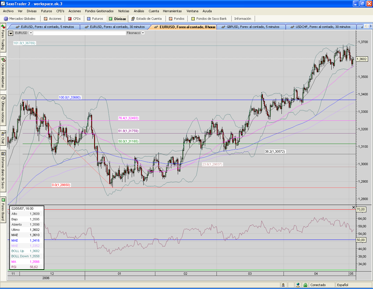 Tras alcanzar con bastante soltura el objetivo 161,8% sobre los 1,3679, las divergencias bajsitas del RSI han funcionado y animado al par a una sana corrección ke de momento lo ha llevado hasta la banda baja de bollinger reforzada con una media ke lo ha detenido en su caída.