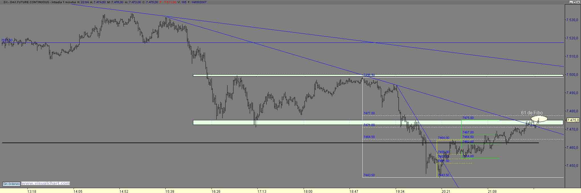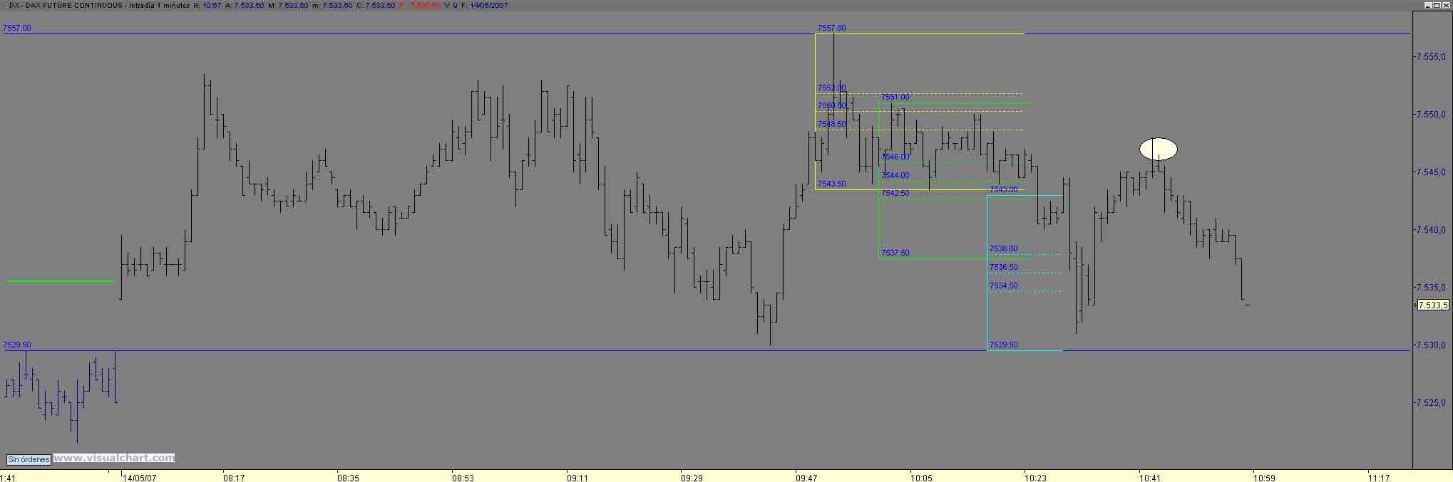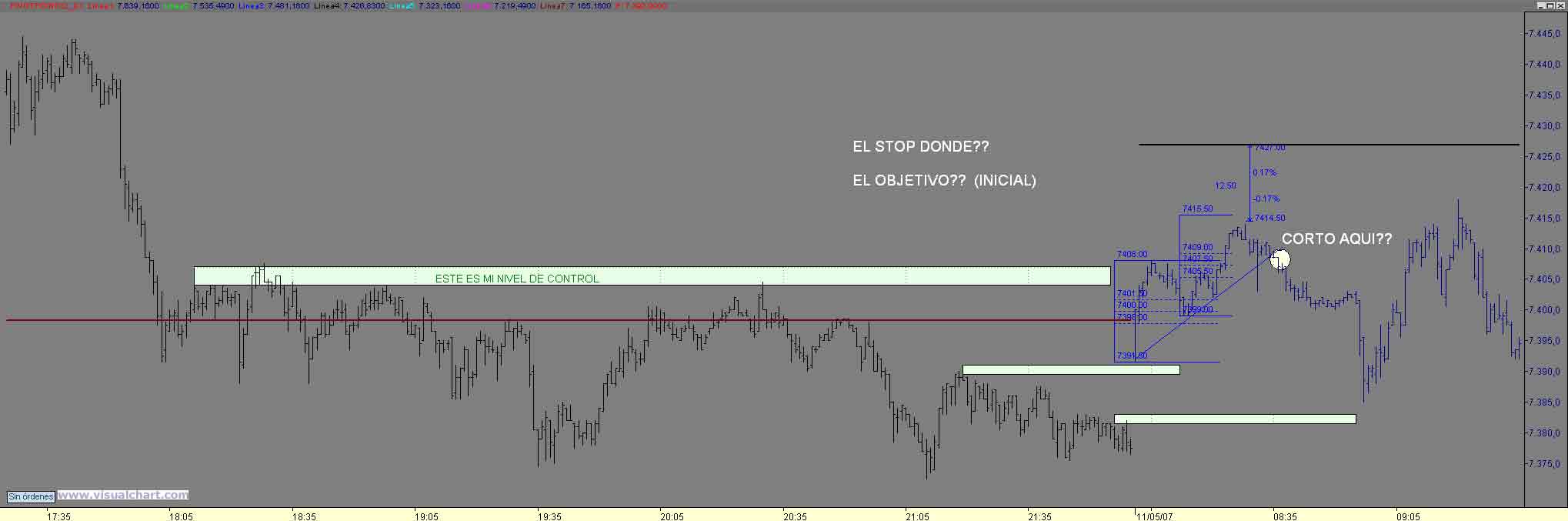 A pesar del corto recorrido que da nuestro amigo como siempre digo hay veces que en aguas pequeñas se pescan piezas grandes, y en ello estamos, despues de los primeros cortos , los largos en el cierre del gap matinal ( ese punto siempre hay que considerralos como objetivo como punto de rebote) nuevamente al maximo intradiario con saltada de stop y.... nueva estructura menor con retro al 7550.50 con obj 37 (1) y 29 (2) donde sin llegar al minimo anterior (30) rebota hasta (curioso el 61 de todo el rango diario donde volvemos a valorar los cortos con obj 22 23 y en eso estamos Saludos