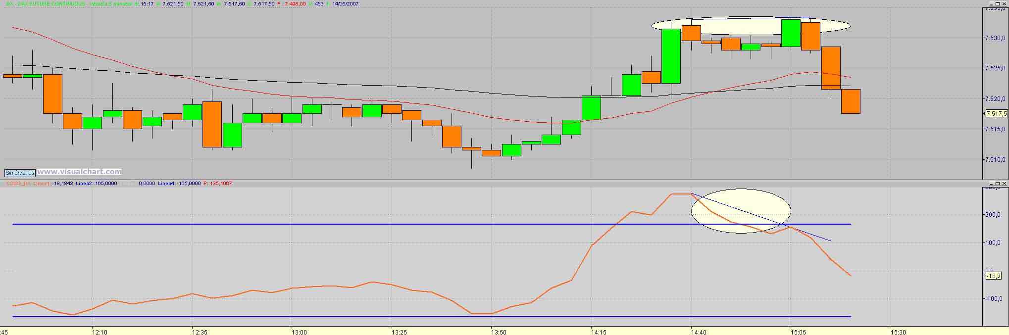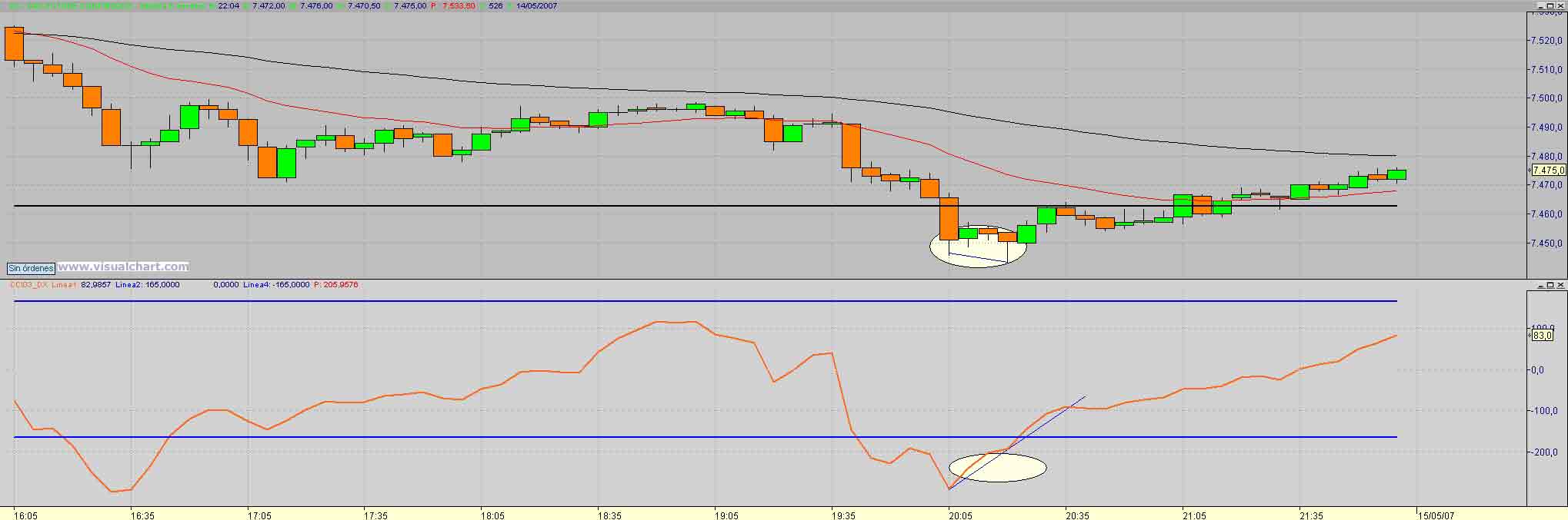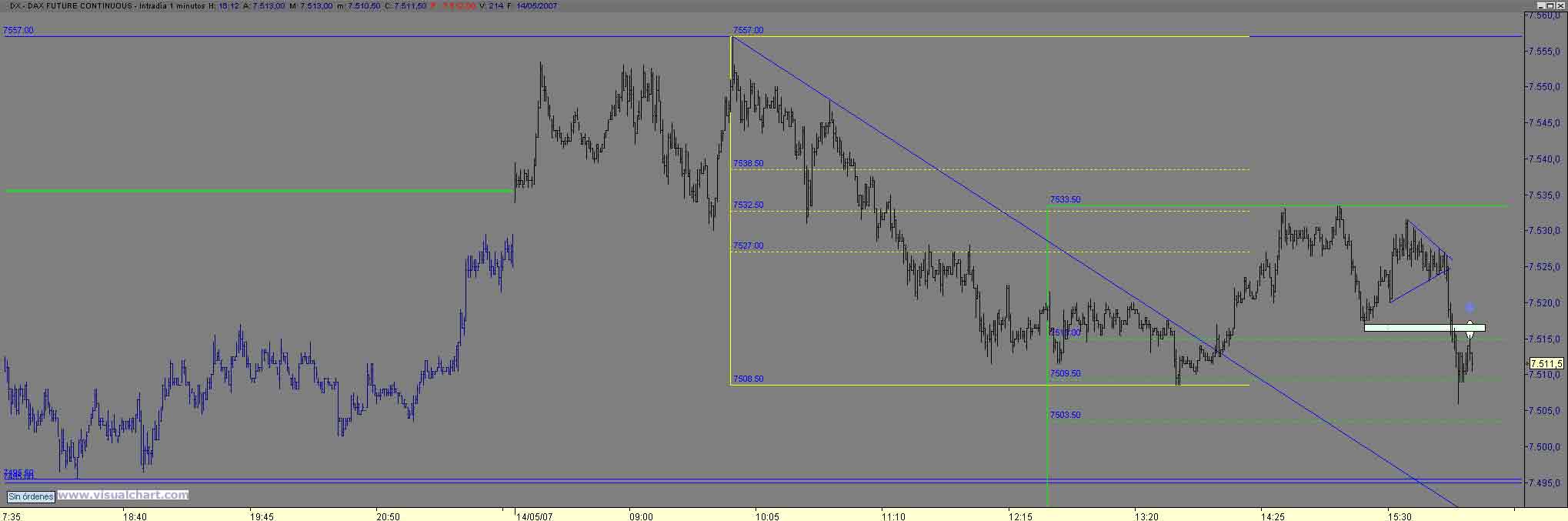 A pesar del corto recorrido que da nuestro amigo como siempre digo hay veces que en aguas pequeñas se pescan piezas grandes, y en ello estamos, despues de los primeros cortos , los largos en el cierre del gap matinal ( ese punto siempre hay que considerralos como objetivo como punto de rebote) nuevamente al maximo intradiario con saltada de stop y.... nueva estructura menor con retro al 7550.50 con obj 37 (1) y 29 (2) donde sin llegar al minimo anterior (30) rebota hasta (curioso el 61 de todo el rango diario donde volvemos a valorar los cortos con obj 22 23 y en eso estamos Saludos