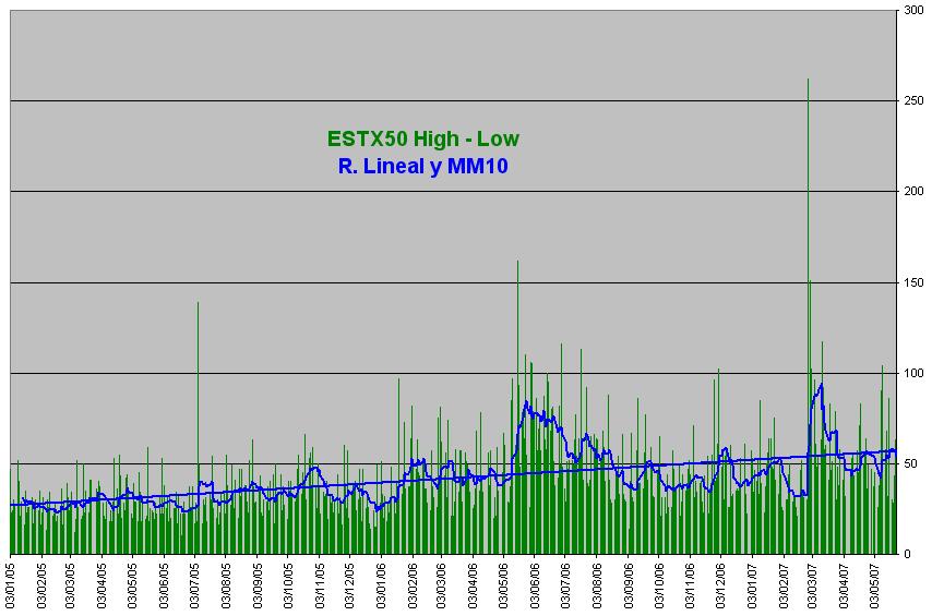 Las barras verticales verdes es el rango intradiario o la diferencia entre Máximo y mínimo de cada día, la raya azul recta es la regresión lineal y la raya azul curva es la media movil de los rangos de 10 días.