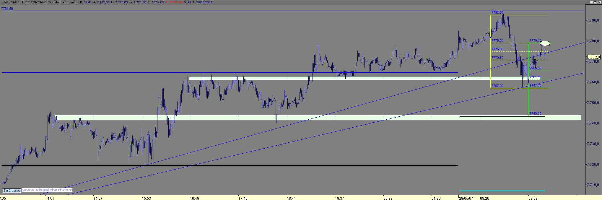 Muy buenos dias descansados deel largo puente bursatil nuestro amigo el Dax quiso reencontrarse a buscar sus amximos anteriores 7794 desde donde sin superralos se deslizo en tres impulsos al nivel del 59 61 coincidente con la direztriz alcista que traemos desde el doble suelo del 7674 donde tomar posiciones largas con obj inicial el 50 61 de Fibo de toda la bajada el 7775 80 y zona de control anterior Saludos