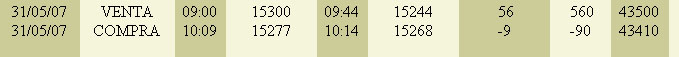 No sé a cuantos habrá engañado éste señor con su página web, pero parece que le da resultado seguir poniendo operativa falsa. Día 31 venta en 15300 curioso pero es el máximo de la barra del primer minuto y compra en 15244 a las 9.44, mirando el gráfico se ve claramente que a las 9.44 el precio está en 15270-15277, ni siquiera colocando las compras y ventas una vez que se ha formado el gráfico lo hace bien para que nadie se de cuenta. La siguiente operación que pone es de disimulo compra a 15277 y a los 5 minutos vende a 15268 perdiendo 9 puntos. Me imagino que a los que ha engañando no han dicho nada y por eso sigue poniendo las operaciones con el gráfico ya formado.