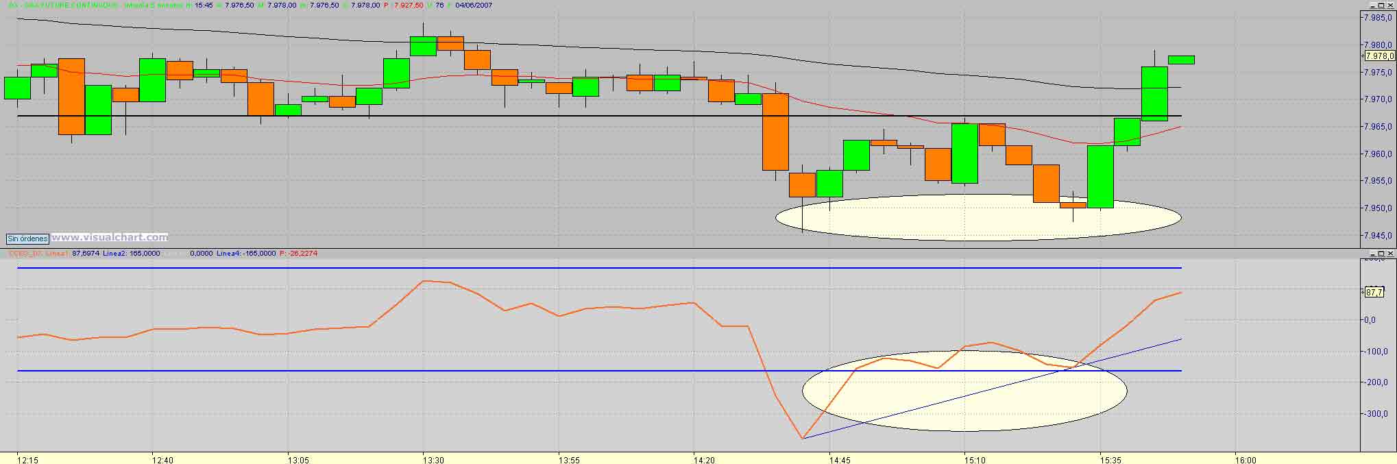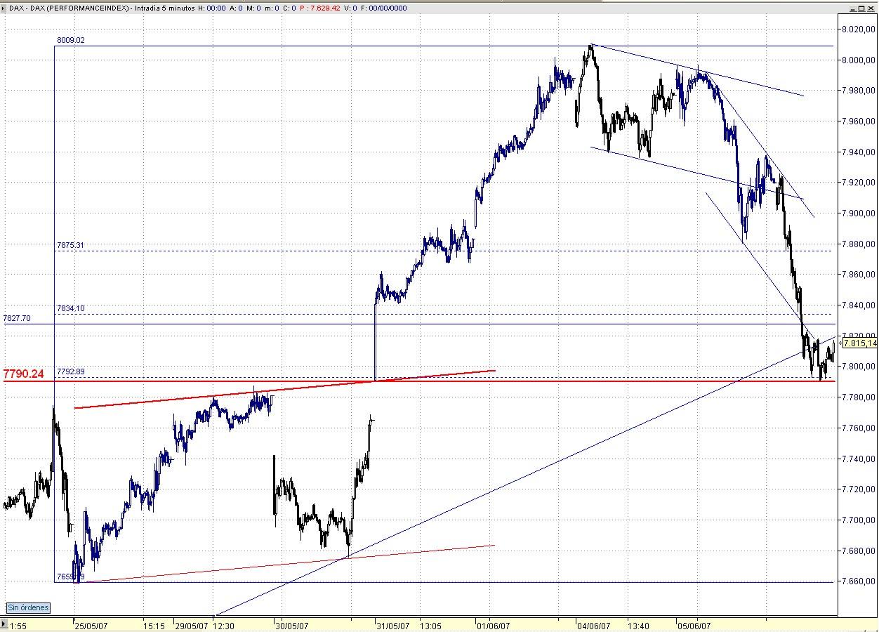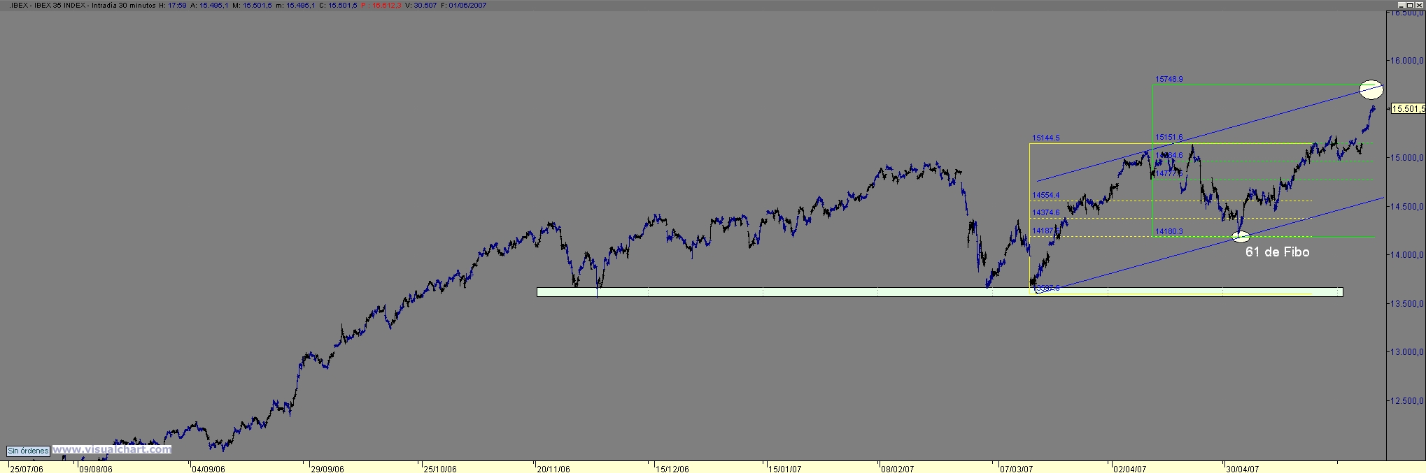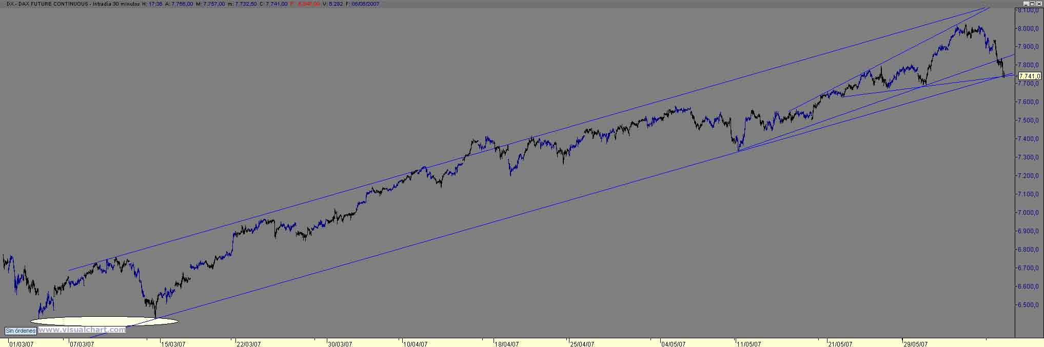 Y continuando con nuestro amigo el DAX pues mirar el graf en 30m cuando esta mañana comentaba que el 7938 era el 50% de Fibo del movimeinto del dia anterior la que nos estaba preparando (yo desde luego no lo pensaba) pero se fue a cumplir su obj de 3 (7693.50) que ademas es zona de control anterior (7675 7690) y deja tocado del ala la direztriz alcista desde el doble suelo en 6424 para mañana la disyuntiva es por abajo ver el 7570 7580 y por arriba volvel al 7800 asique a pensar esta noche Saludos