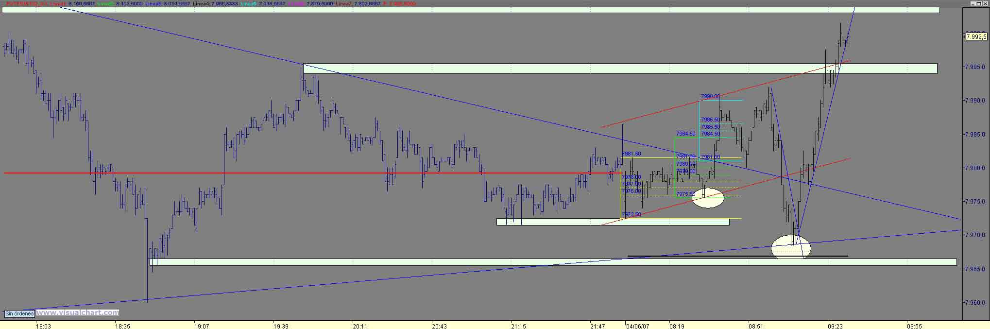 Muy bueno dias nuestro amigo se desperto en el mismo sitio donde cerramos el viernes con lo que a priori las zonas de control eran por arriba el 7995 y por abajo el 7965 7970 ese rango se lo comio antes de la apertura Europea en tres impulsos poara ir a buscar la zona del 70 en la apertura que es zona de pivot y a partir de ahi a volar en busca del 95 8000 sin practicamente un retroceso veremos si no pierde el 92 95 donde nos lleva Saludos