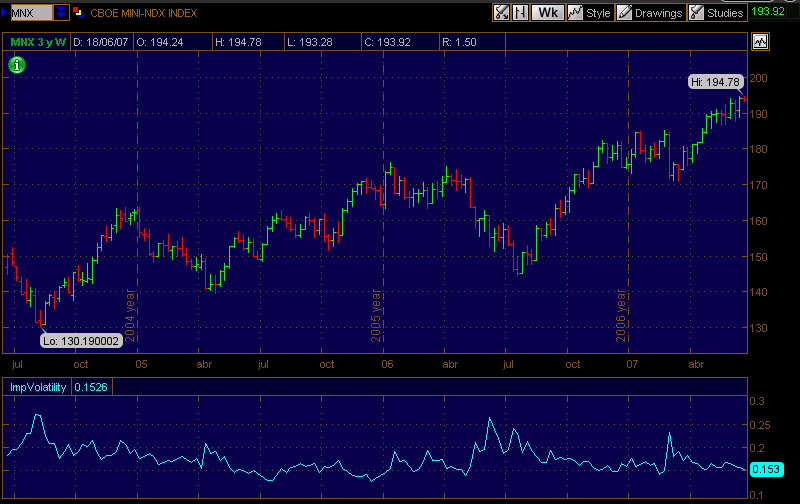 Si cojemos las opciones el CBOE MINI-NDX INDEX veremos que el vencimiento de julio cotiza a una VI (volatilidad implícita) del 15%. Como quedan solo 30 días a vencimiento cualquier estrategia compradora de volatilidad es bastante arriesgada. Digamos que la Theta nos espera con el cuchillo afilado.